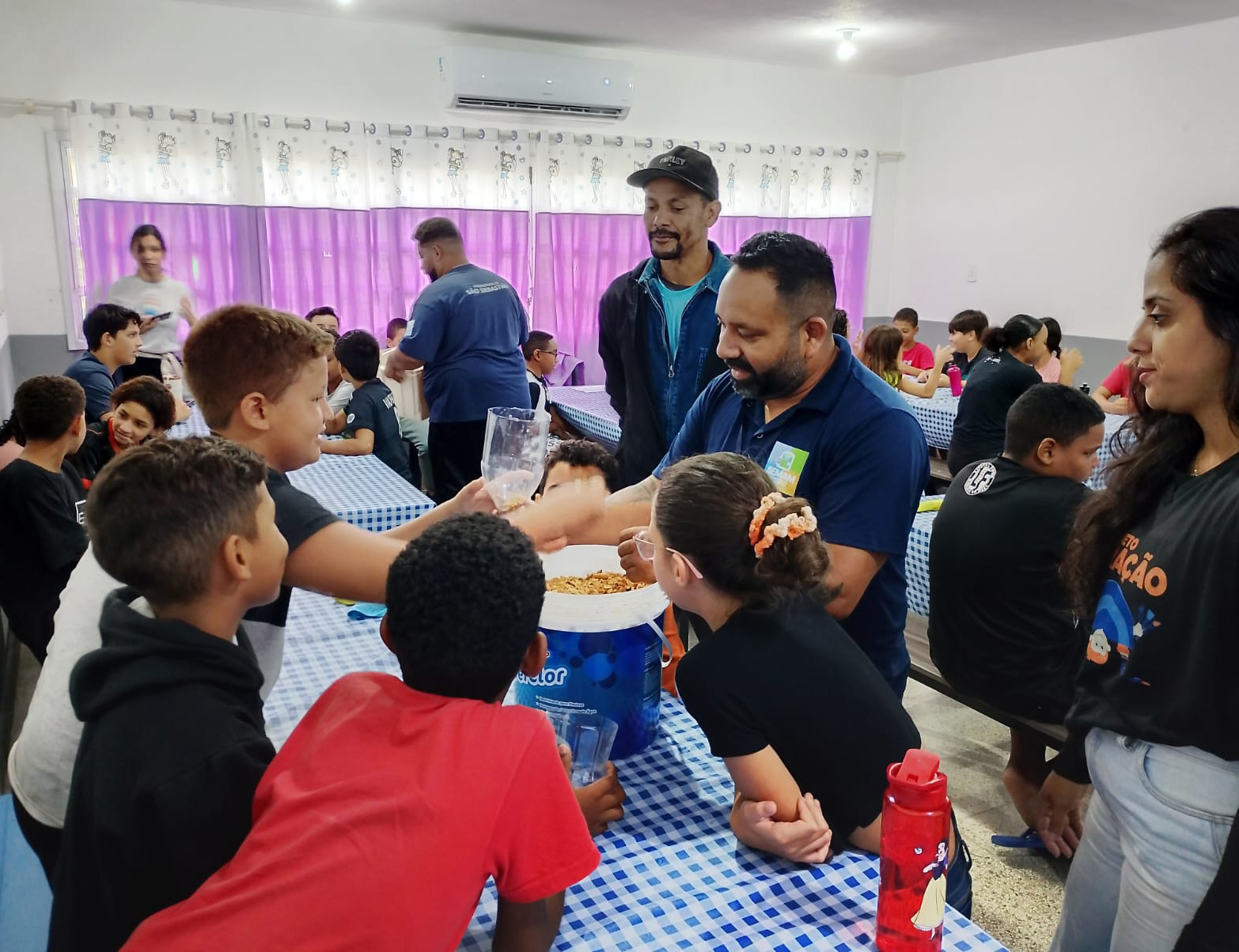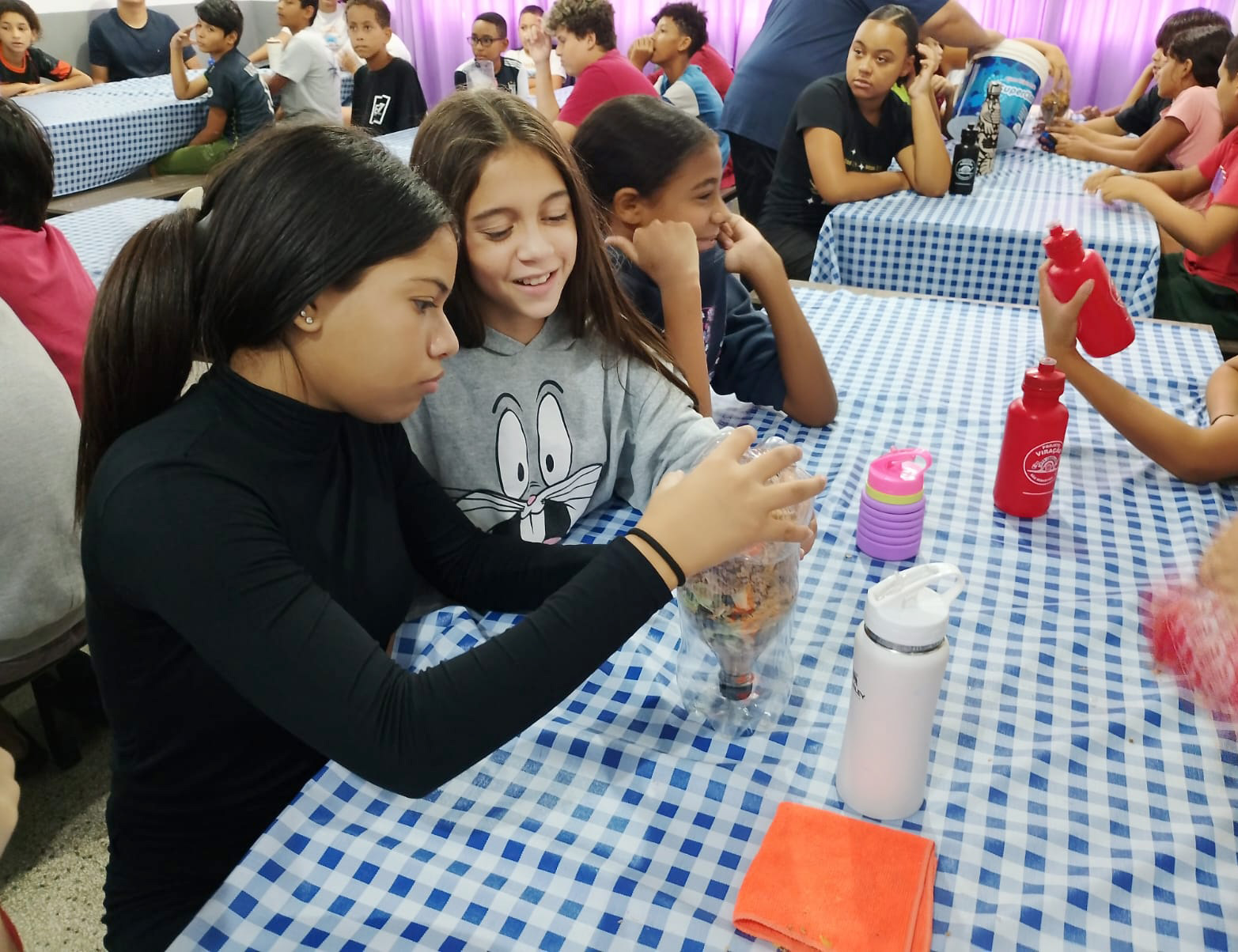 #PraTodosVerem: As imagens mostram um grupo de crianças e adolescentes participando de uma oficina de educação ambiental em uma sala com mesas cobertas por toalhas xadrez azuis e brancas. Adultos vestindo uniformes da Secretaria de Meio Ambiente (Semam) orientam os jovens, que utilizam garrafas plásticas reaproveitadas para criar sistemas de compostagem, manuseando substrato orgânico seco. Fim da descrição.