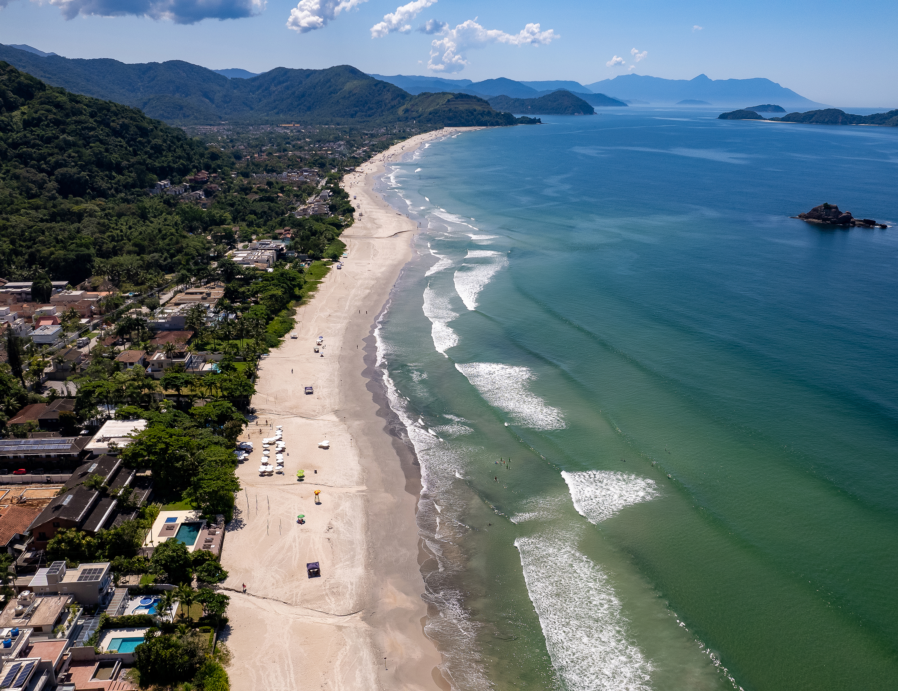#PraTodosVerem: Imagens aéreas mostram praias de São Sebastião com amplas faixas de areia, mar azul-esverdeado e a Mata Atlântica ao redor, além de pessoas aproveitando o litoral em um cenário de grande beleza natural. O município está atualmente com 100% de balneabilidade em suas praias, garantindo mar próprio para banho e mais segurança para moradores e visitantes. Fim da descrição.