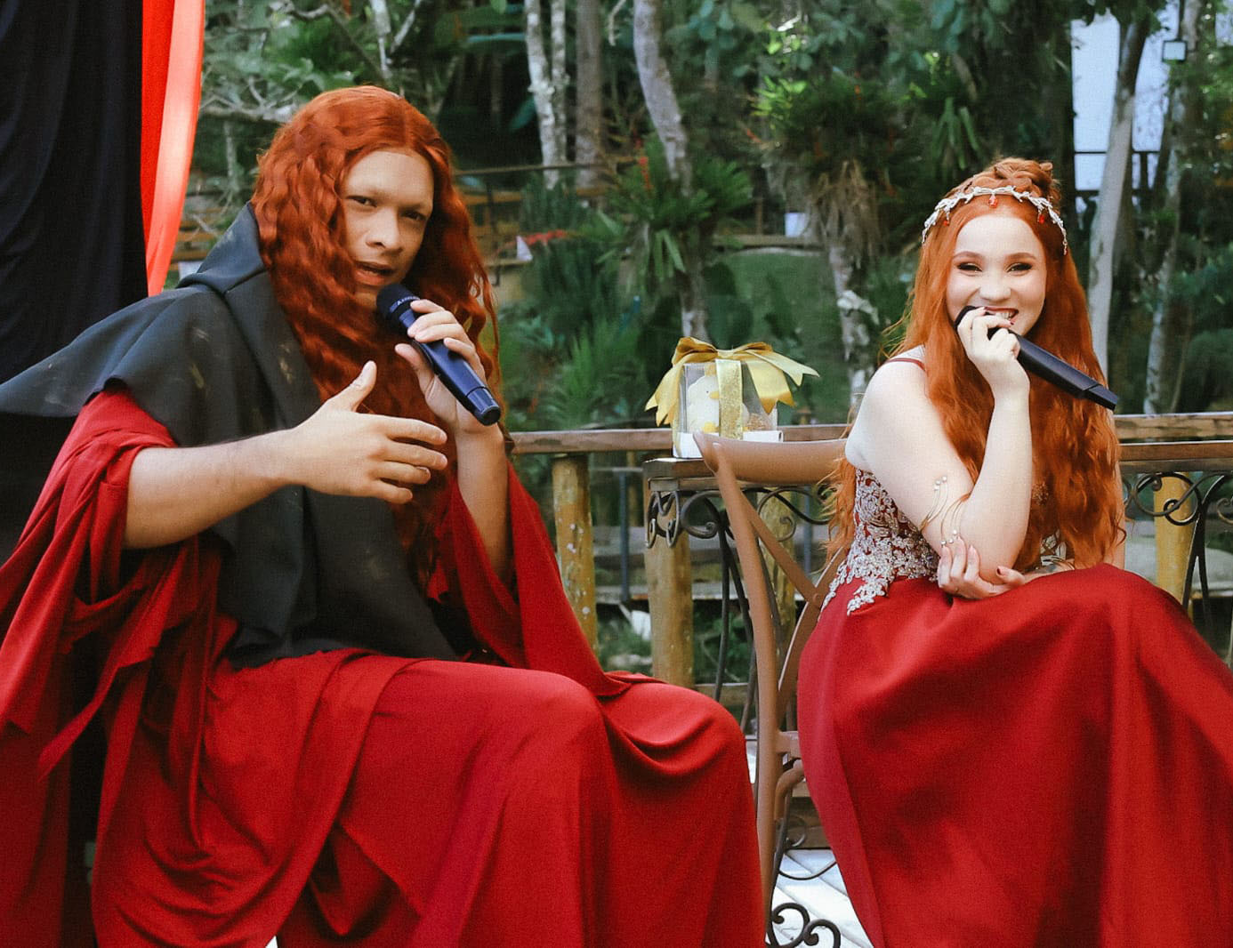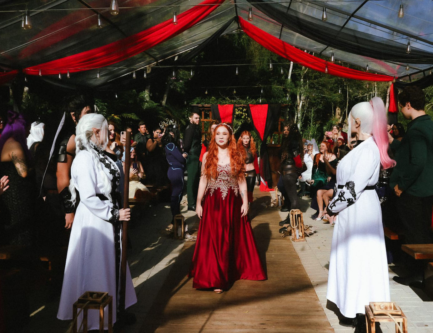 #PraTodosVerem: Imagens de evento temático de fantasia medieval. Grupo de pessoas caracterizadas posa em frente a cenário com bandeiras vermelhas; ao centro, mulher com vestido longo vermelho, com público ao redor e decoração em vermelho e preto. Capa de livro de fantasia, com personagem destacada. Fim da descrição