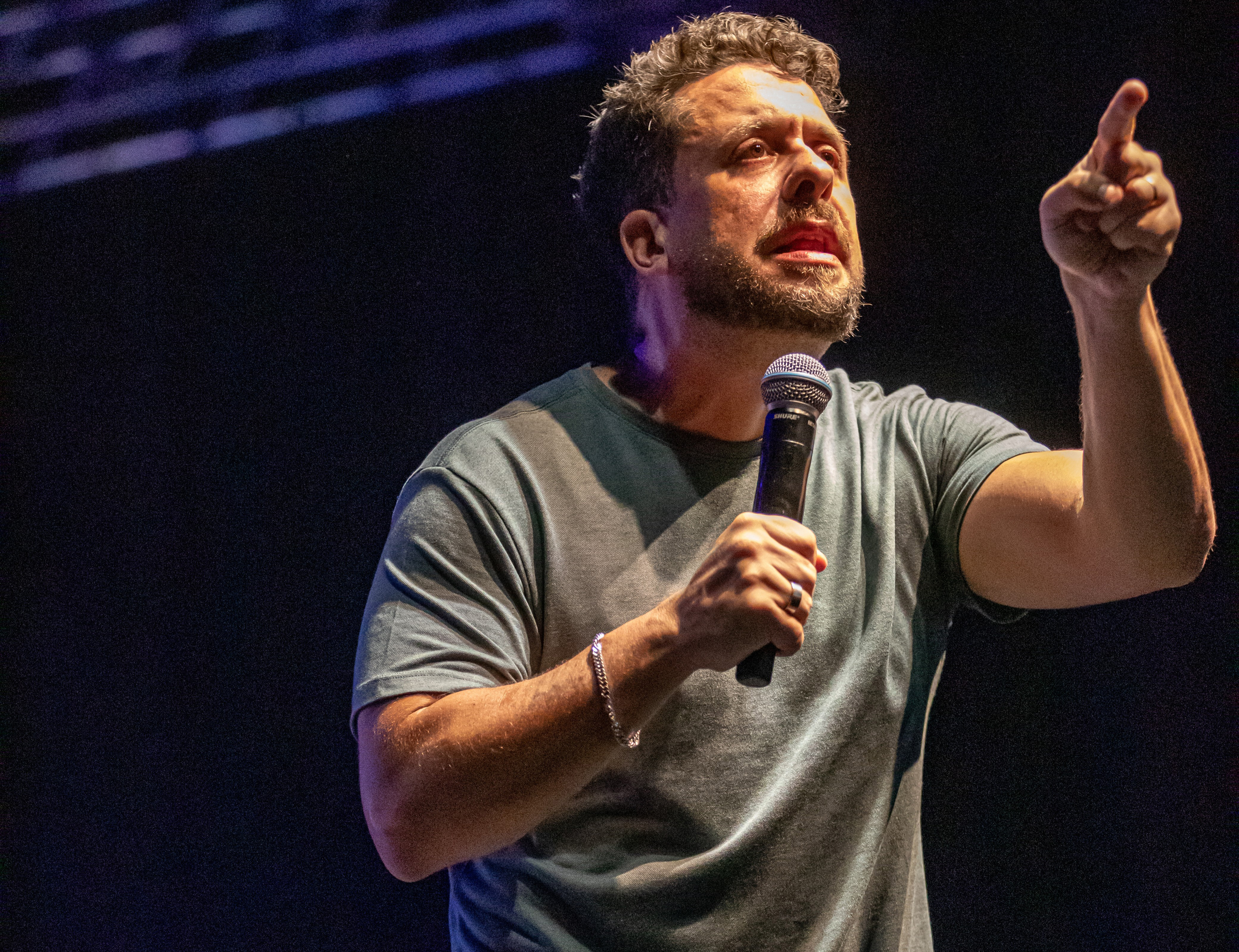 #PraTodosVerem: Imagens do Festival HAHAHA em São Sebastião mostram apresentações de comédia em palco com iluminação cênica, artistas com microfone e grande presença de público. A plateia aparece atenta, em um ambiente amplo e estruturado. Fim da descrição