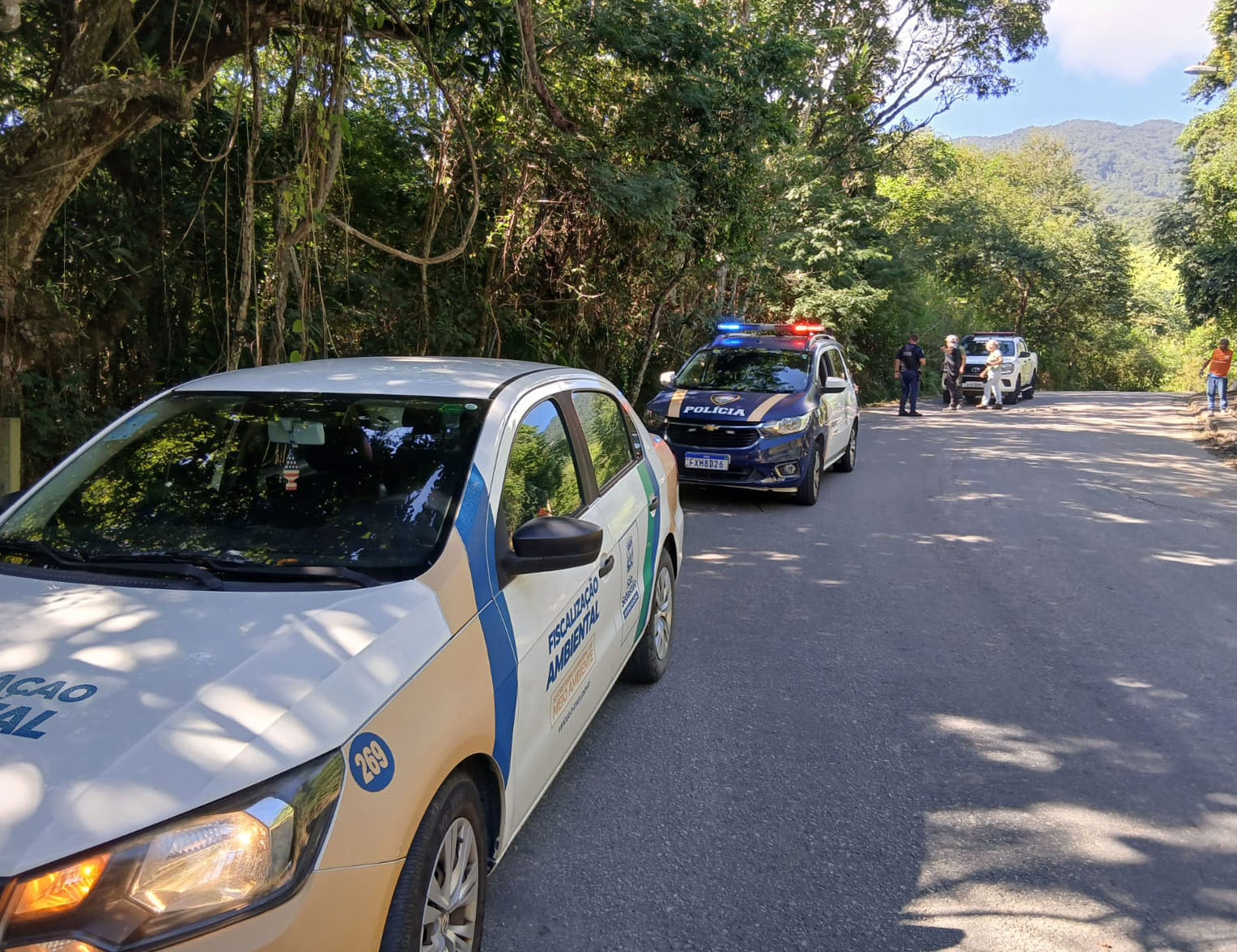 #PraTodosVerem: Em uma estrada, agentes da Prefeitura de São Sebastião e da Polícia Ambiental realizam fiscalização em área de Mata Atlântica. As imagens mostram indícios de intervenção irregular, com cercas e resíduos de construção civil. Fim da descrição.