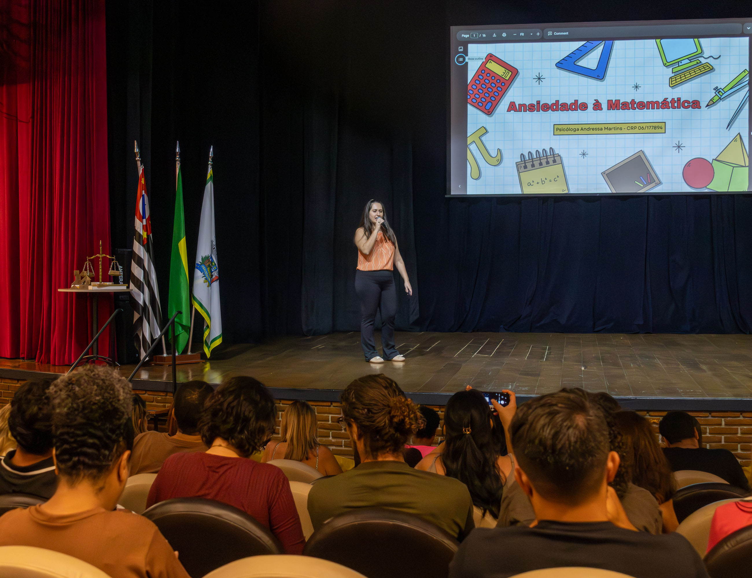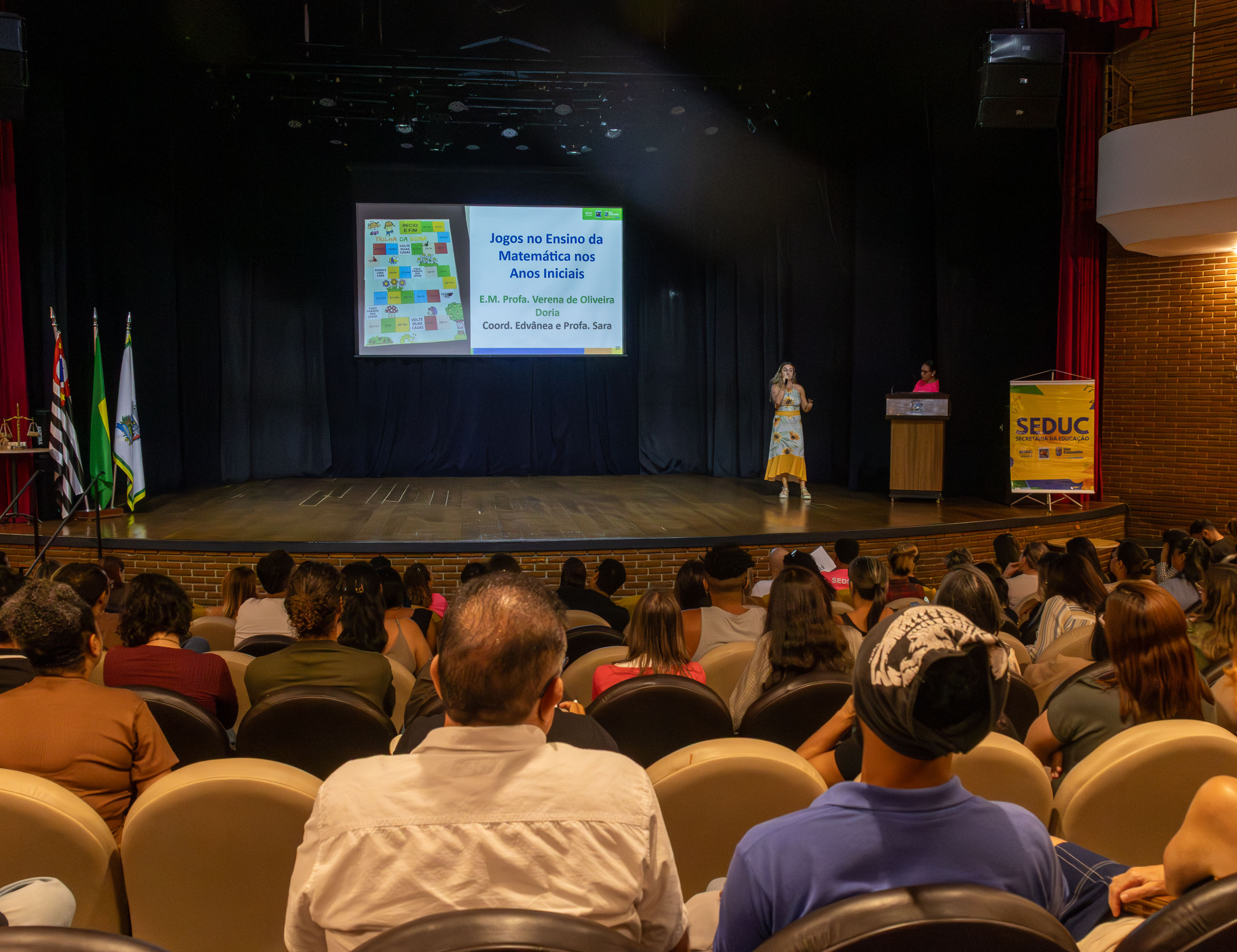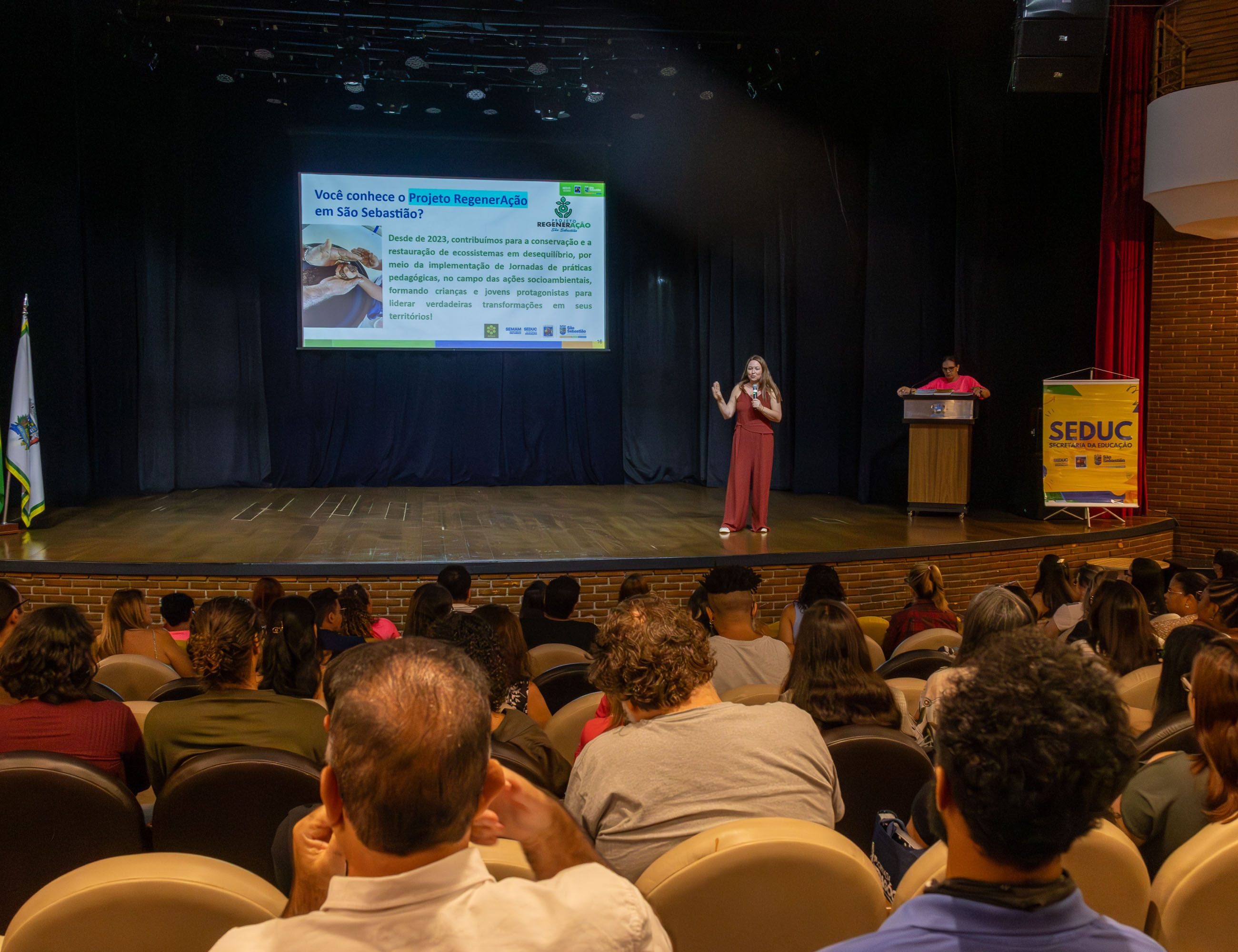 #PraTodosVerem: Este conjunto de quatro fotografias registra um evento educacional realizado em um auditório amplo, com paredes de tijolos à vista e iluminação quente. As três primeiras imagens mostram a perspectiva da plateia em direção ao palco, onde palestrantes apresentam slides sobre projetos pedagógicos, como o ‘Projeto Regeneração’ e o ensino da matemática através de jogos, com a presença de bandeiras oficiais e um banner da Secretaria da Educação (Seduc). A última foto captura um momento de celebração coletiva, reunindo dezenas de participantes no palco e nos balcões superiores; muitos vestem camisetas rosa vibrante e todos acenam alegremente para a câmera, transmitindo um clima de integração e encerramento de atividades. Fim da descrição.