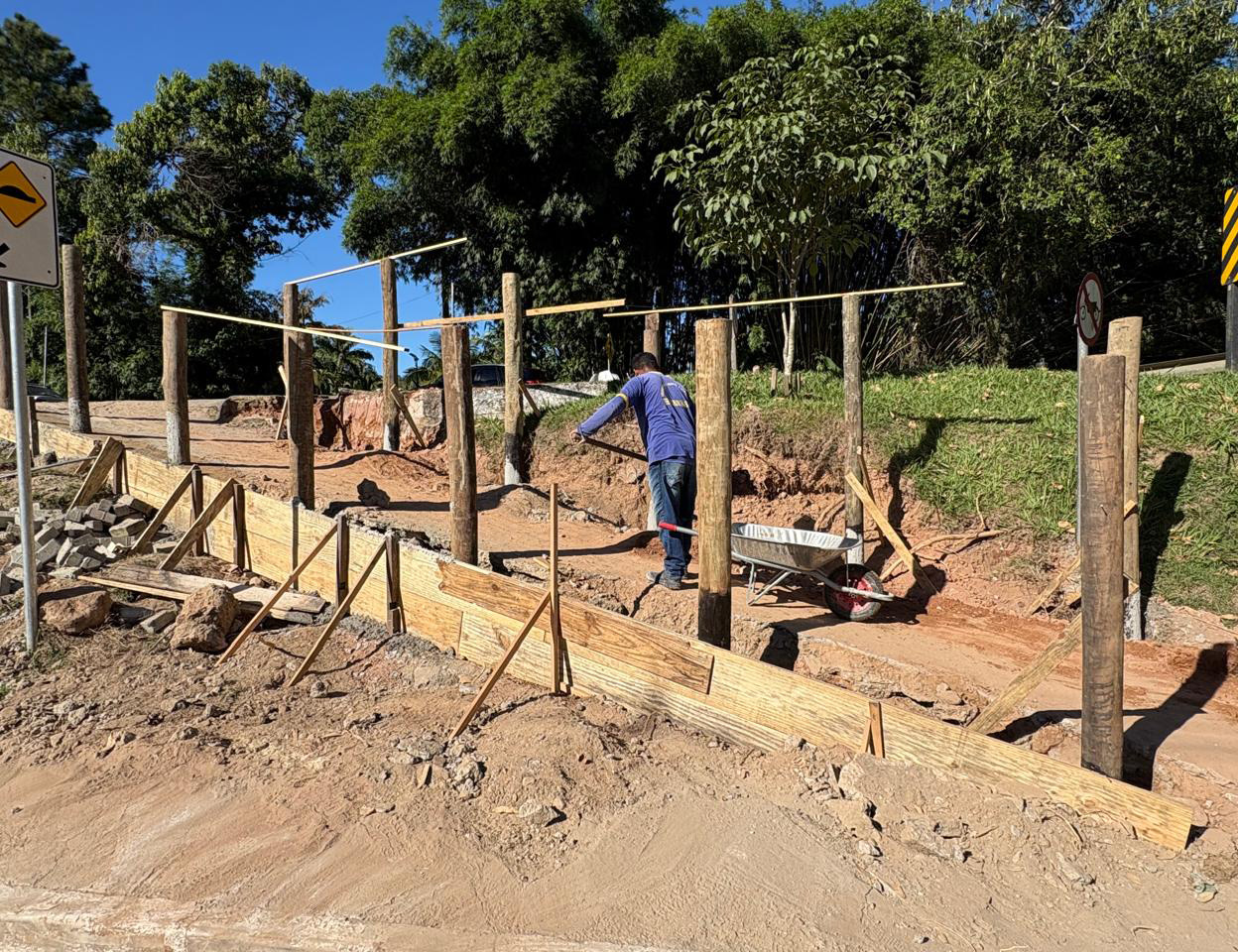 #PraTodosVerem: Conjunto de imagens mostra a instalação de hastes de madeira para a colocação do novo guarda-corpo, a preparação dos moldes para concretagem da passarela e a atuação de servidores da Sesep nas obras de melhoria do local. Fim da descrição.