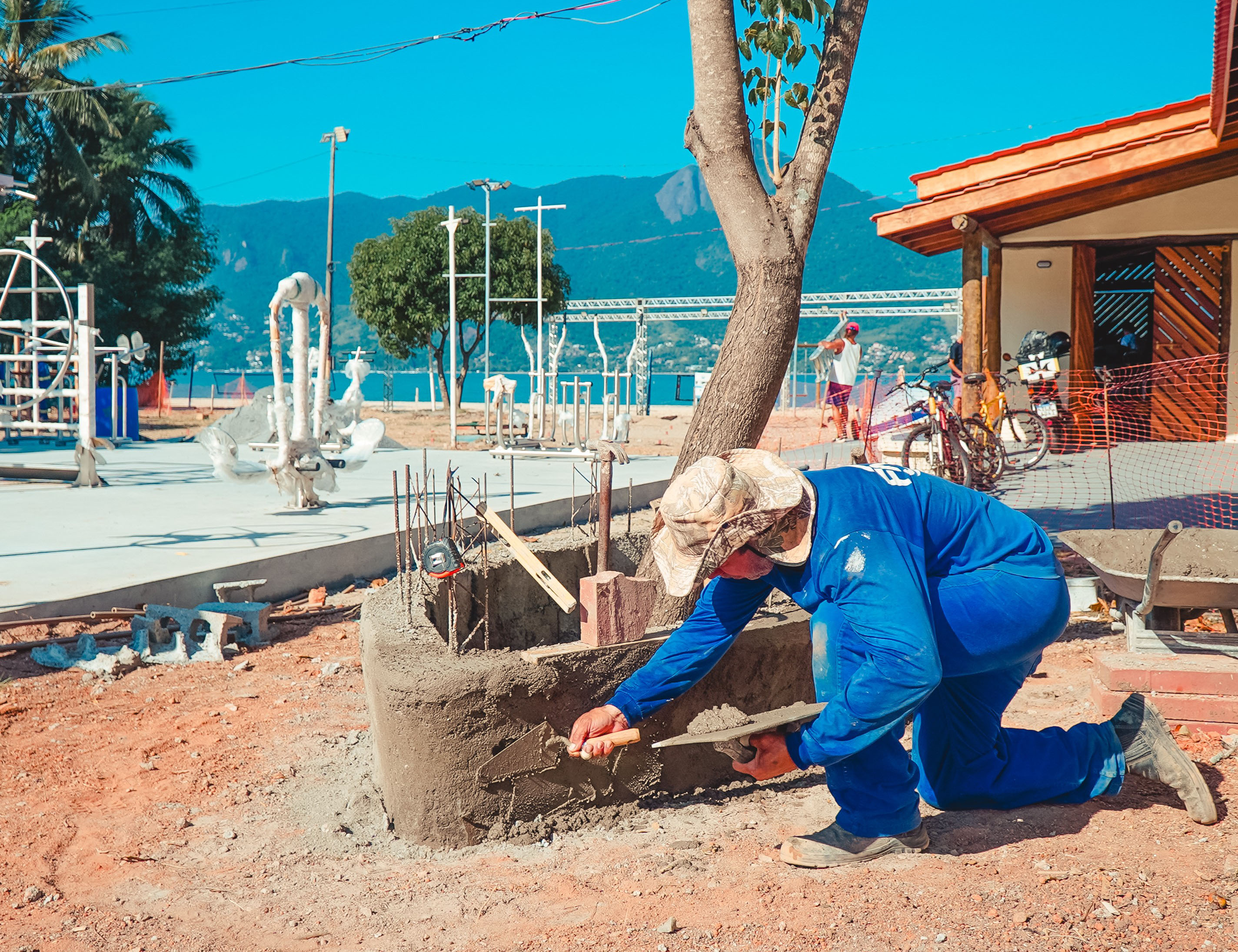 #PraTodosVerem: Trabalhadores operários realizando obra de reconstrução e reparação de praça perto da praia. Fim da descrição.