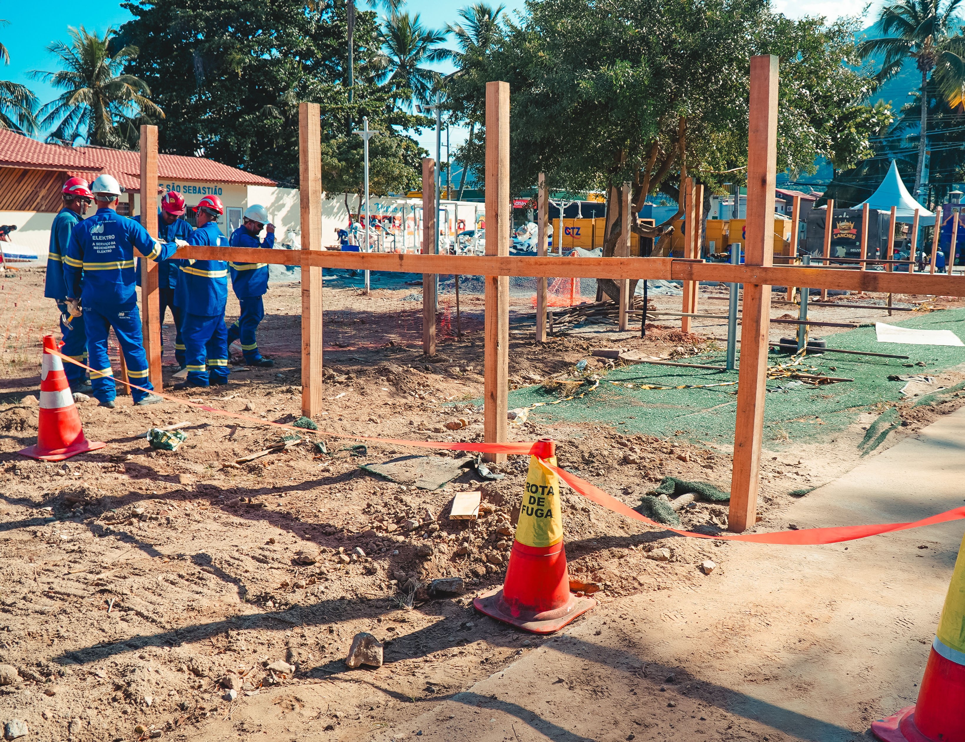 O projeto contempla academia ao ar livre com novos equipamentos, parquinho, áreas de convivência e praça de alimentação estruturada com pergolado para organização dos food trucks. Também está em implantação o cabeamento subterrâneo de energia e iluminação, solução adotada em centros urbanos contemporâneos. A faixa de areia receberá iluminação em LED, ampliando as condições para a prática esportiva no período noturno.