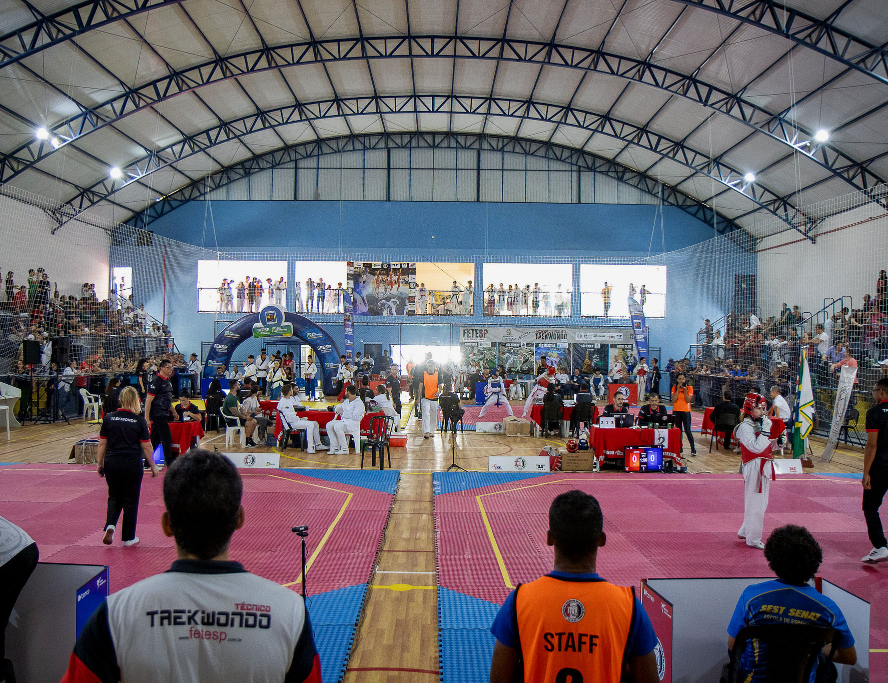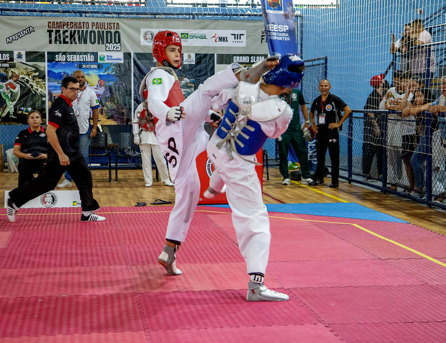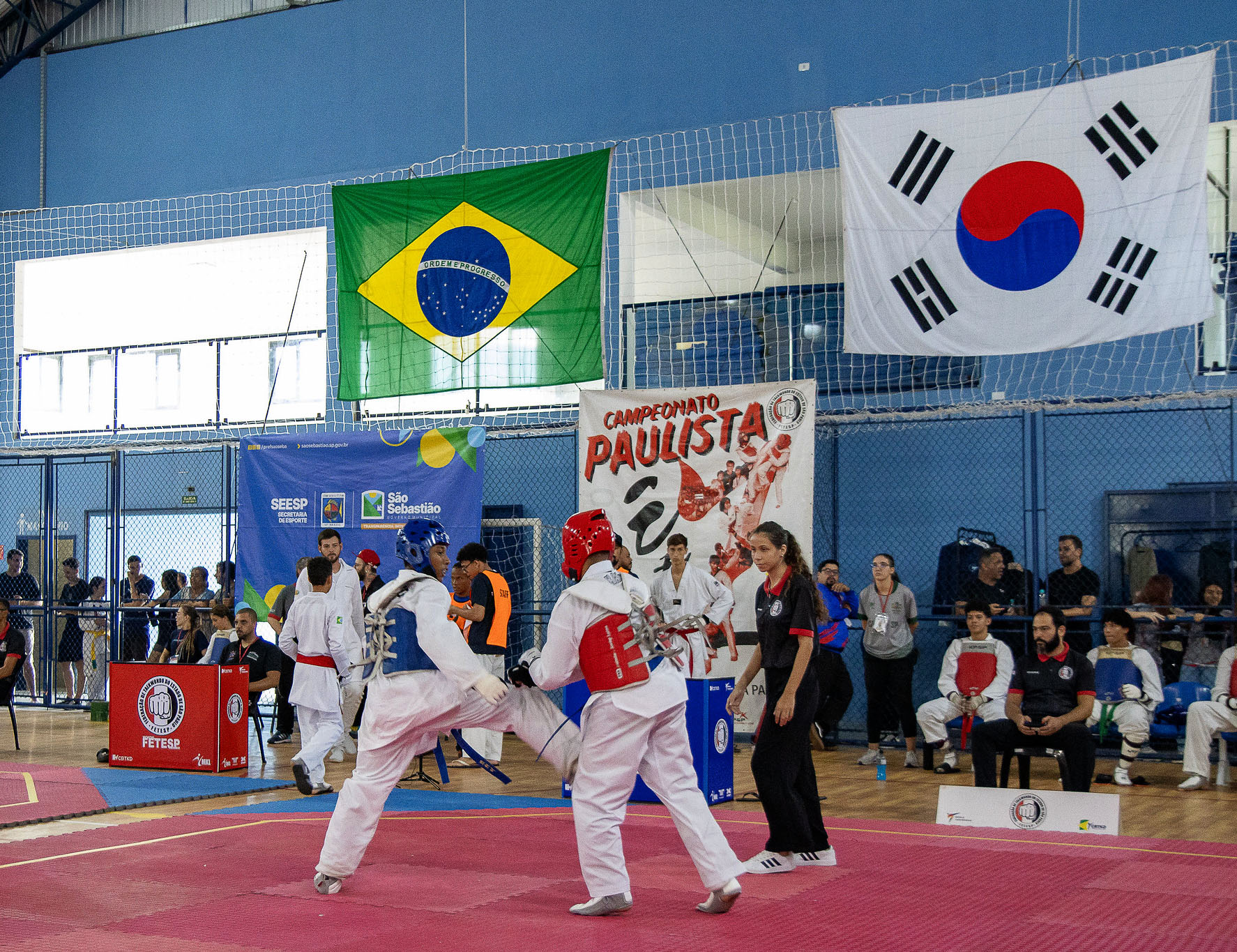 #PraTodosVerem: No Ginásio Municipal José de Souza Gringo atletas de Taekwondo protagonizam combates intensos durante o Campeonato Paulista 2025. Vestindo doboks brancos e proteções em azul e vermelho, os competidores aplicam chutes precisos sobre o tatame sob a supervisão rigorosa de árbitros e técnicos. O ambiente é vibrante, com o público acompanhando cada movimento das arquibancadas protegidas por redes. Ao fundo, banners do evento e as bandeiras do Brasil e da Coreia do Sul decoram o amplo espaço de teto metálico. Fim da descrição.