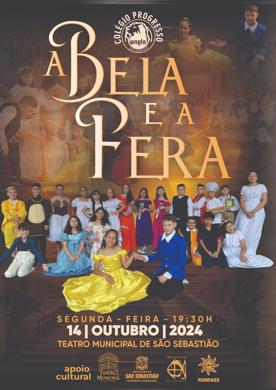 O grupo de alunos do 5º ano do Ensino Fundamental do Colégio Progresso apresenta a peça ‘A Bela e a Fera, sob a direção geral de Márcia Fernanda. A história apresenta uma jovem chamada Bela, que está cansada da vida provinciana de uma pequena cidade francesa, onde vive também o galã Gastón que, apesar de derreter corações, não consegue conquistá-la com seu jeito grosseiro.