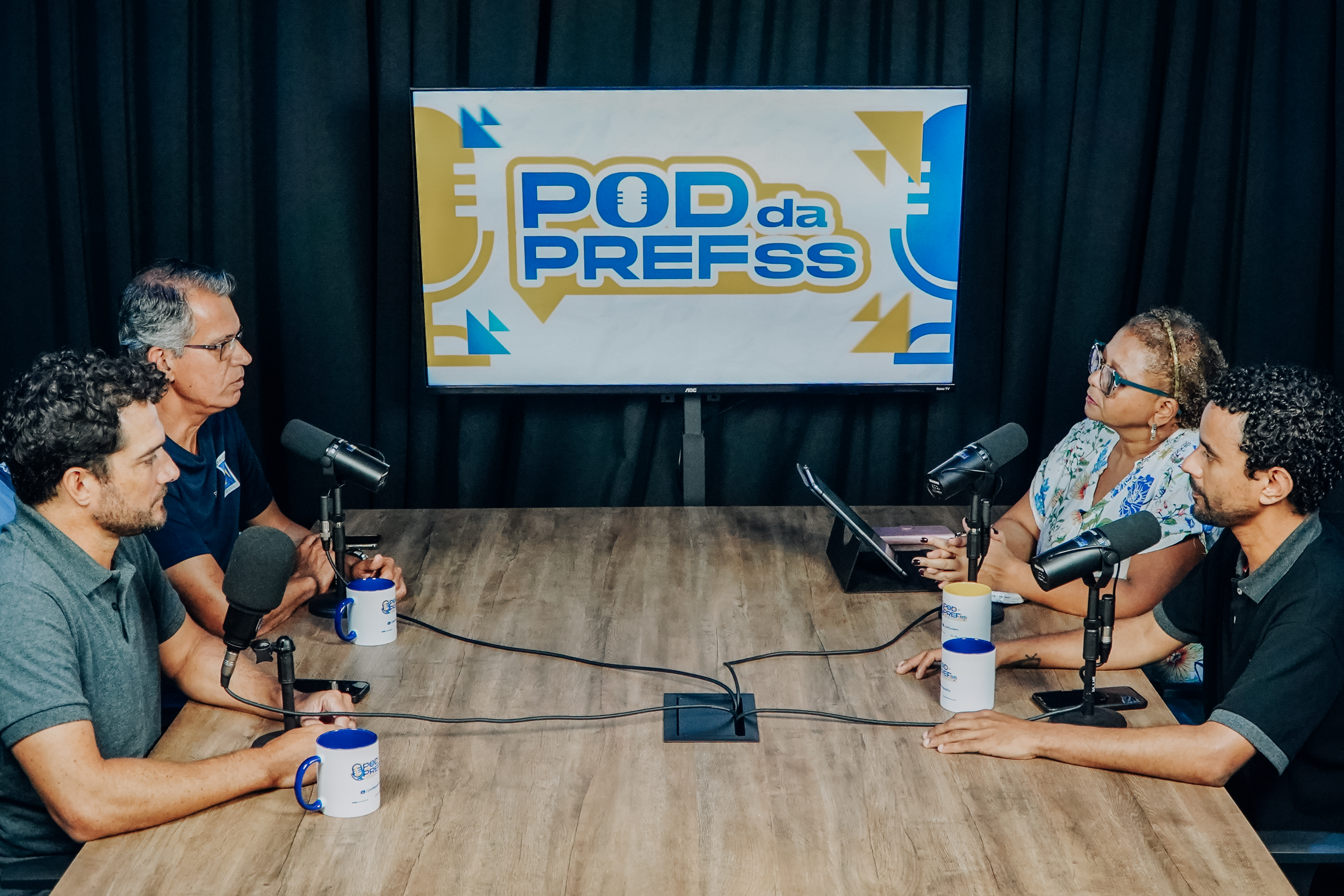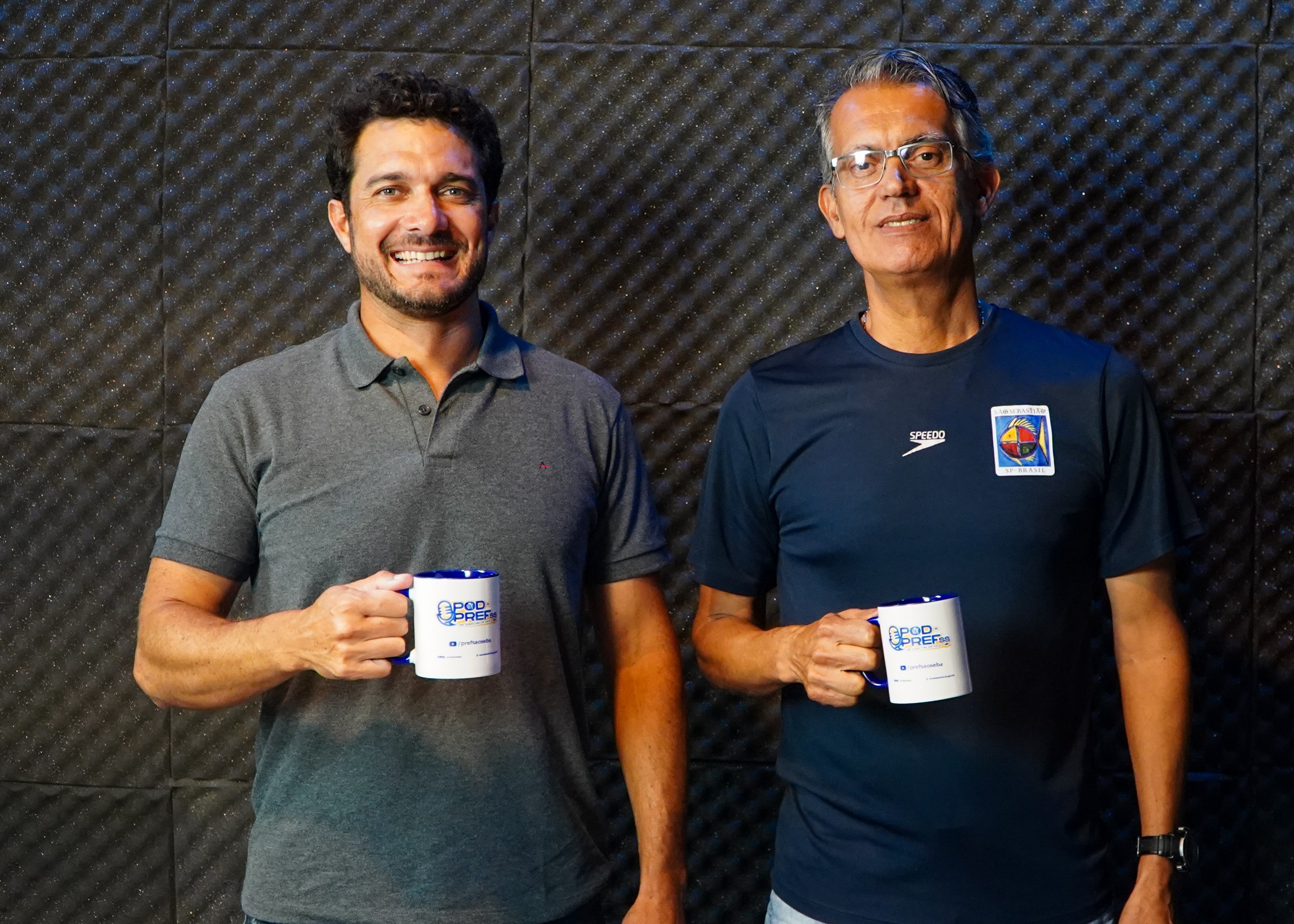 #PratodosVerem: imagens do estúdio do Pod da PrefSS durante entrevista do secretário de Esportes de São Sebastião, Ubiratan Mourão, e do chefe de Divisão de Esportes Náuticos da Secretaria de Esportes (Seesp), Frank Constâncio, que participam de uma conversa descontraída com os apresentadores Mara Cirino e Rafael César. Fim da descrição.
