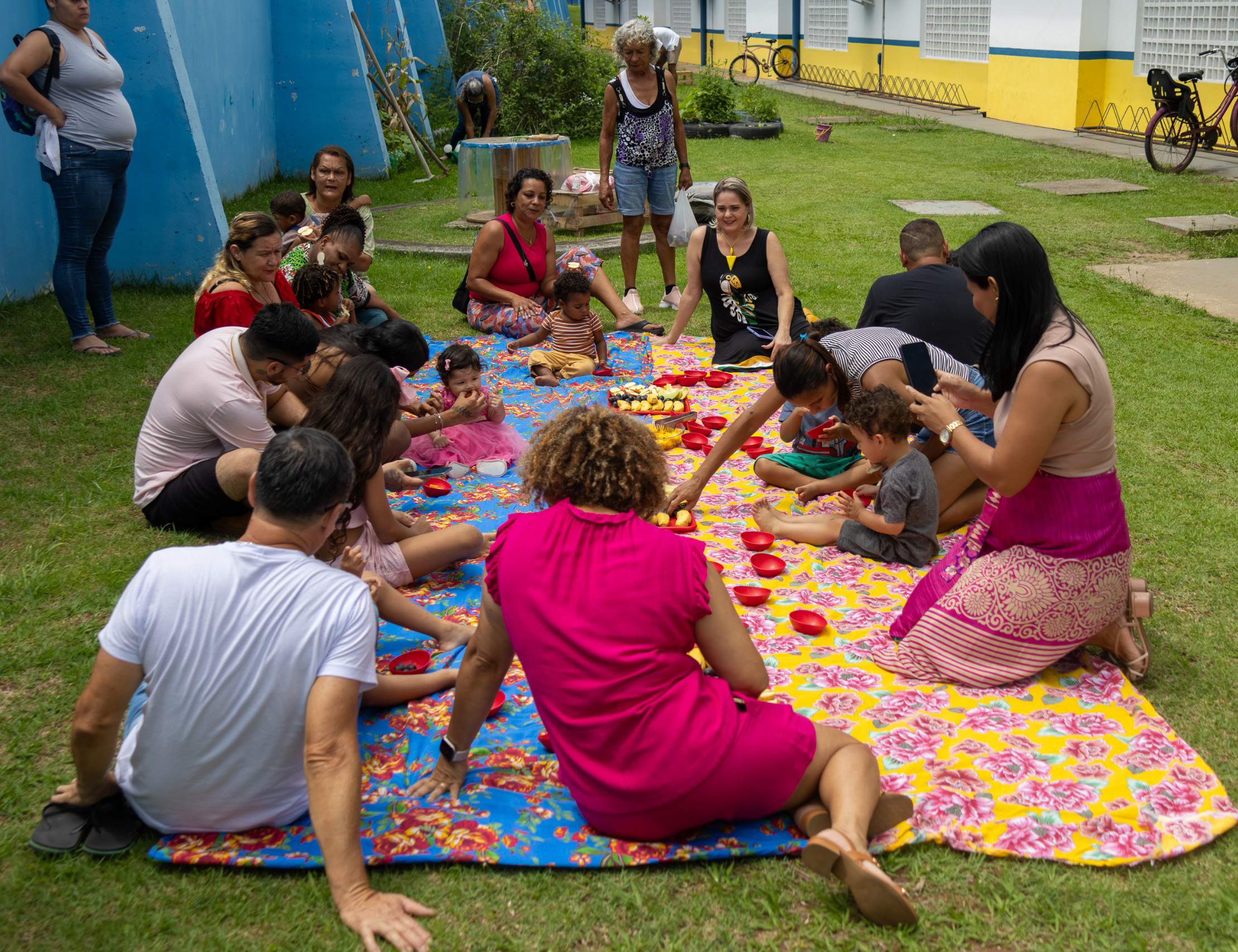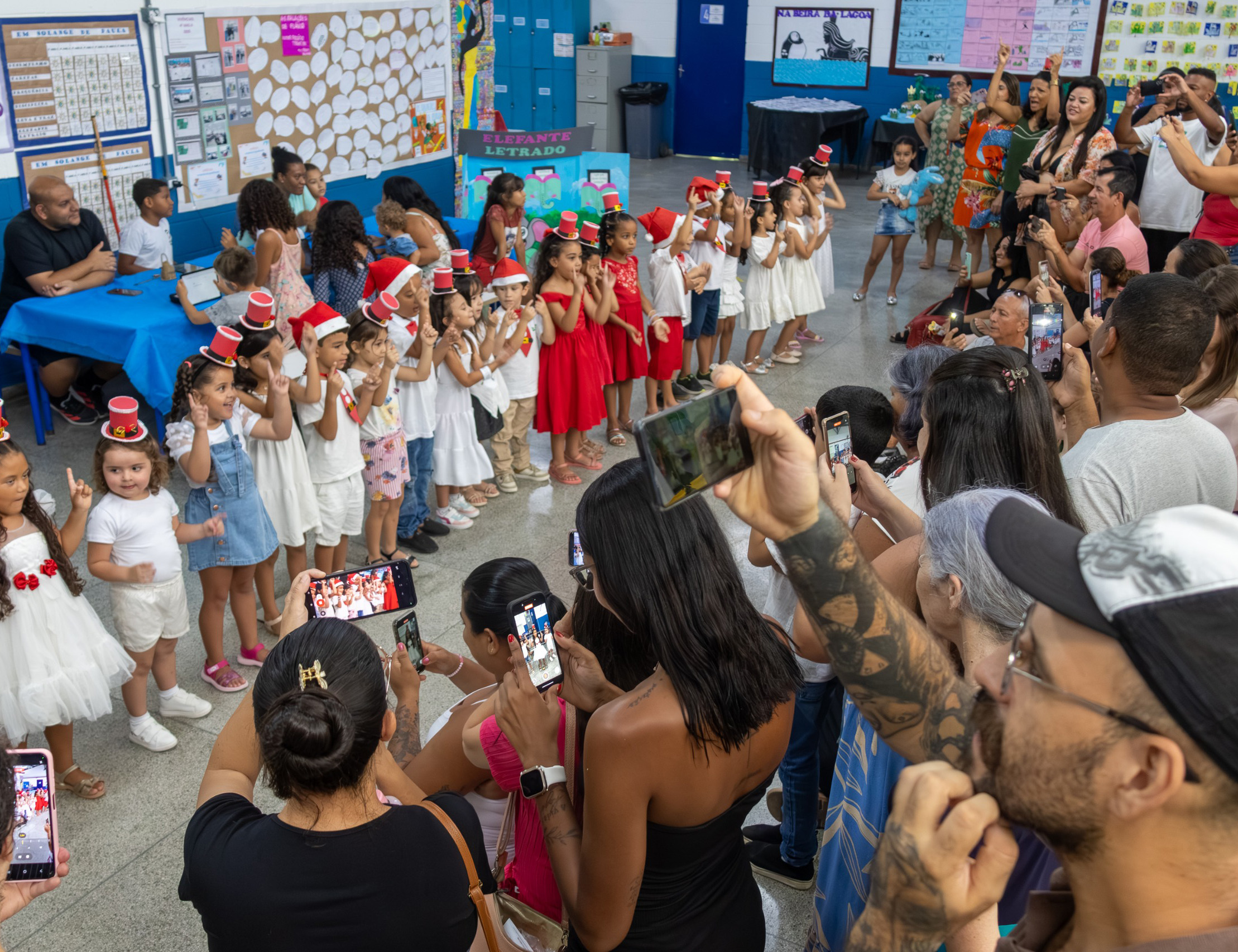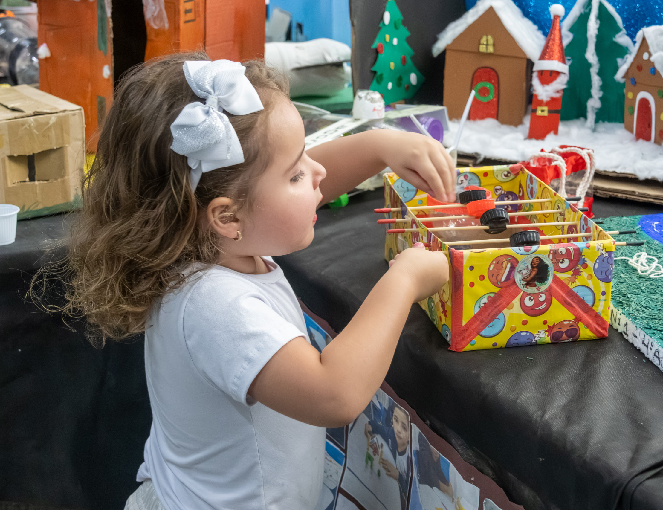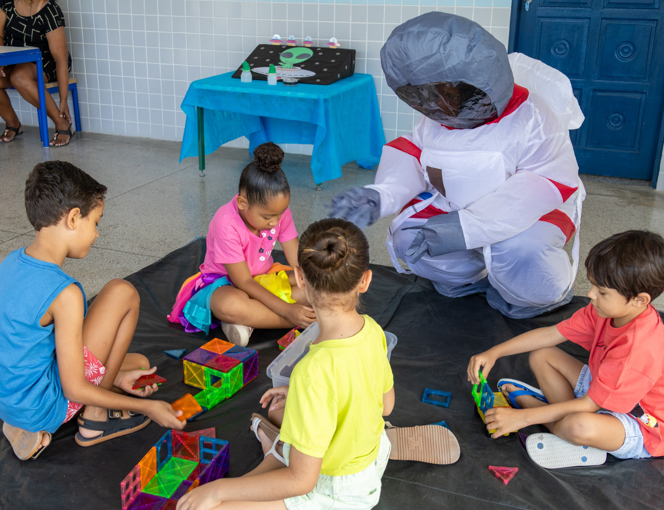 #PraTodosVeremConjunto de quatro fotografias coloridas documentando atividades de um evento escolar. Na primeira imagem, uma menina branca com laço grande na cabeça interage com um brinquedo artesanal feito de caixa de papelão e tampinhas. Na segunda imagem, um grupo de adultos e crianças participa de um piquenique ao ar livre, sentados sobre toalhas estendidas na grama. Na terceira imagem, quatro crianças sentadas no chão brincam com peças de montar magnéticas coloridas, acompanhadas por uma pessoa vestida com uma fantasia completa de astronauta. Na quarta imagem, uma turma de crianças, algumas com adereços natalinos, realiza uma apresentação em um pátio enquanto uma grande plateia de pais e responsáveis assiste e filma com aparelhos celulares.