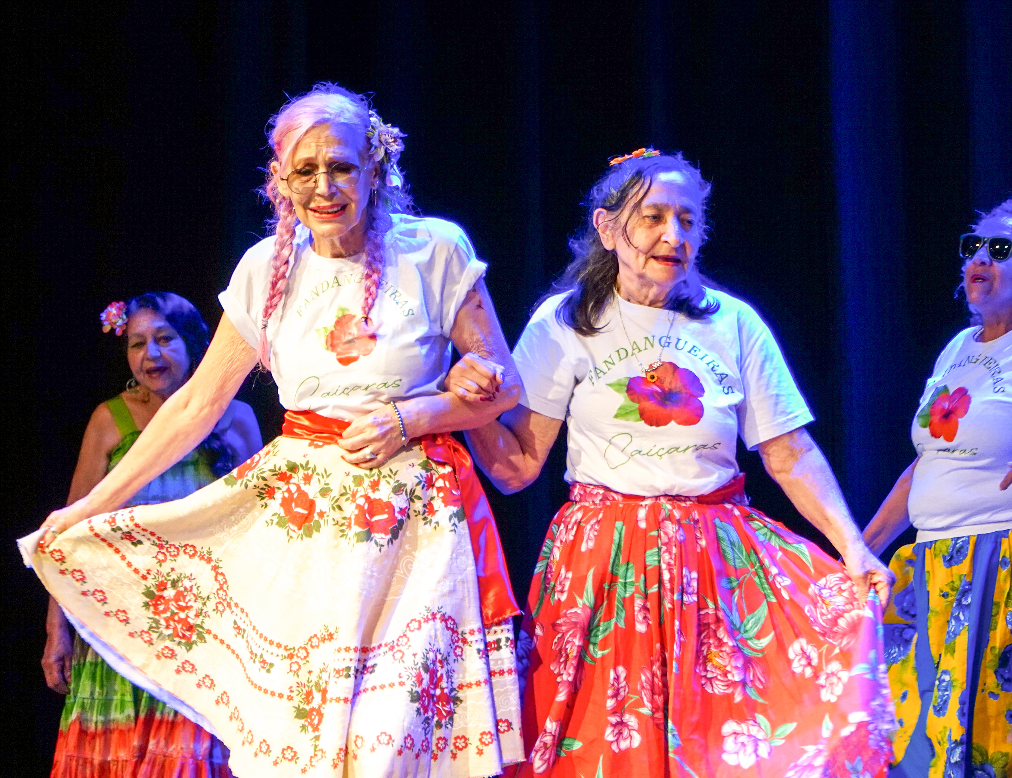 #PraTodosVerem: Conjunto de quatro fotografias que mostram mulheres idosas em atividades de lazer e bem-estar em São Sebastião. Na primeira, elas sorriem e acenam de dentro de canoas havaianas coloridas no mar; na segunda, caminham em grupo por uma trilha arborizada com reflexos em uma poça d'água; na terceira, vestem saias floridas e camisetas brancas enquanto dançam o fandango em um palco; e na quarta, realizam exercícios de alongamento com bambolês na areia da praia, sob um céu ensolarado. Fim da descrição.