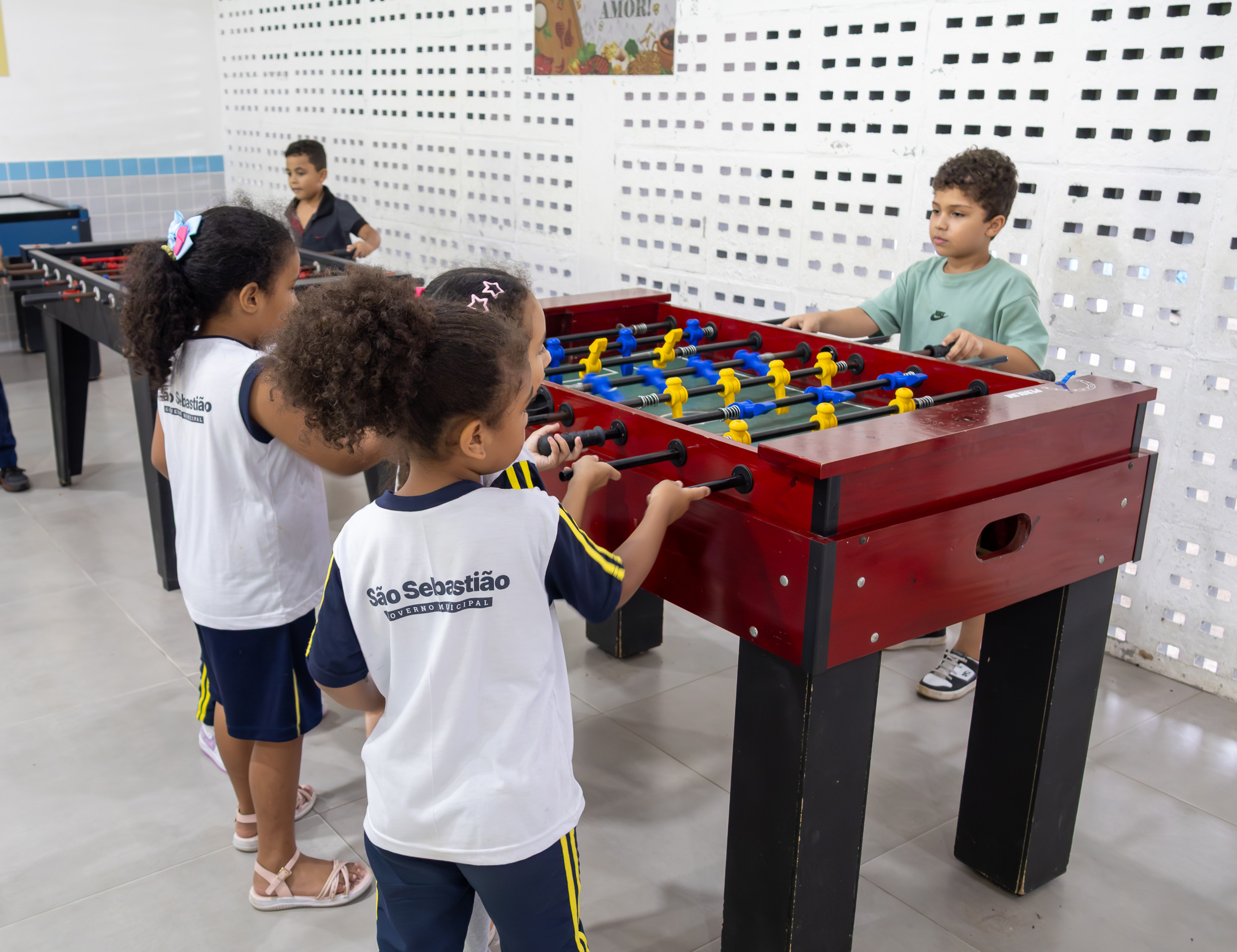 #PraTodosVerem: Conjunto de quatro fotos de estudantes da rede municipal de São Sebastião em ambiente escolar. As imagens mostram crianças sorridentes em salas de aula e momentos de lazer, vestindo uniformes brancos e azuis com detalhes amarelos e o logotipo do governo municipal. Há registros de uma menina escrevendo, alunos jogando pebolim e um menino fazendo sinal de positivo, destacando a integração e o cotidiano escolar. Fim da descrição.