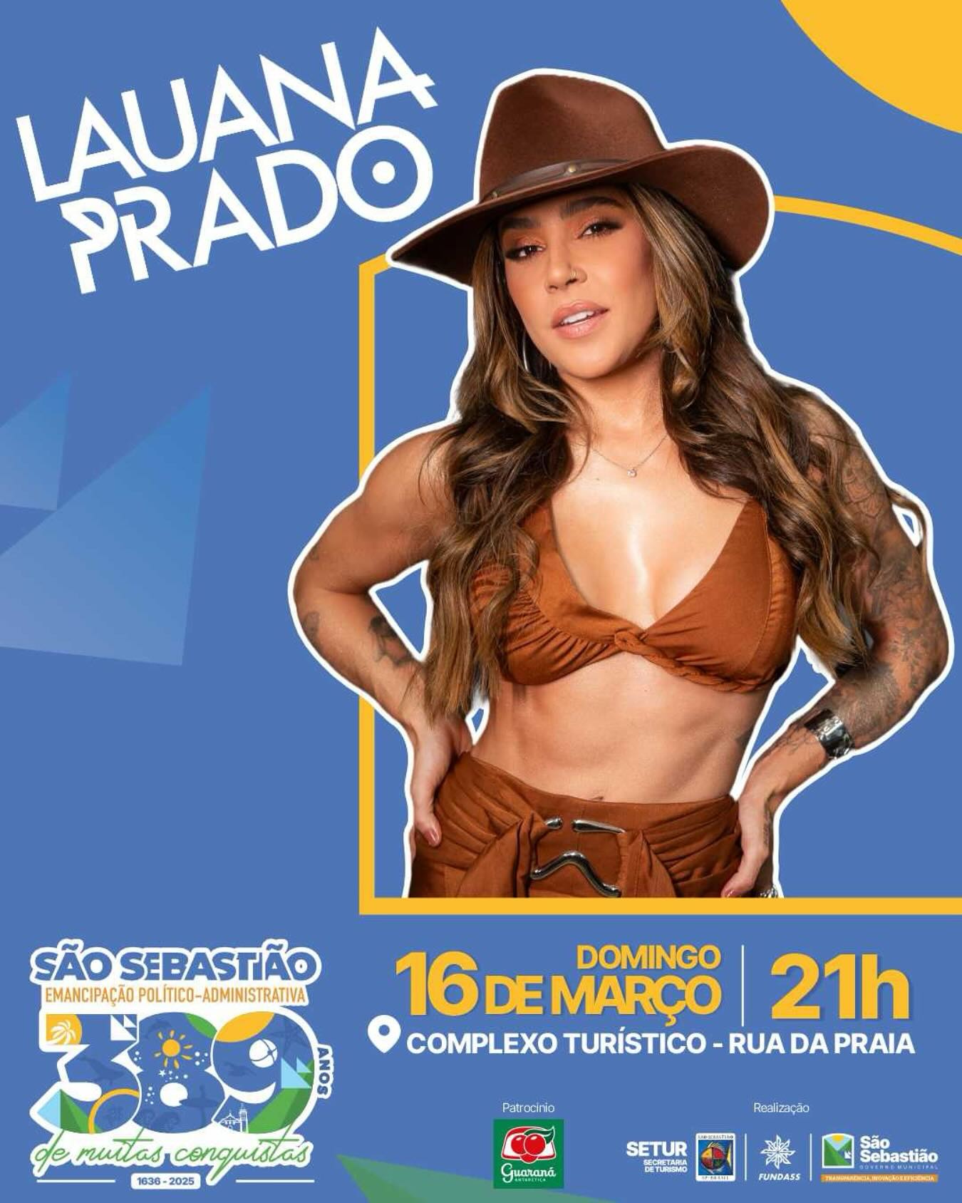 No dia do aniversário da cidade, dia 16 de março (domingo), quem sobe ao palco do Complexo Turístico da Rua da Praia é a cantora e compositora Lauana Prado. Dona da voz marcante do sucesso ‘Cobaia’, a sertaneja também viralizou recentemente com sua versão de ‘Escrito nas Estrelas’, clássico de Tetê Espíndola, alcançando o Top 1 do Spotify Brasil e o Top 30 Global na principal plataforma de streaming de áudio.