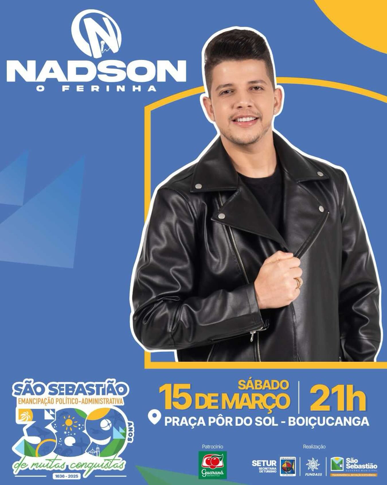 Já no dia 15 de março (sábado), será a vez do cantor Nadson O Ferinha se apresentar no palco da Praça Pôr do Sol, na praia de Boiçucanga. O cantor se destacou nacionalmente com o hit ‘Cadê Seu Namorado Moça?’ e emplacou sucessos como ‘Duas’, regravada ao lado de Dilsinho, e ‘Sinal’, em parceria com João Gomes, que já ultrapassa 19 milhões de visualizações no YouTube.