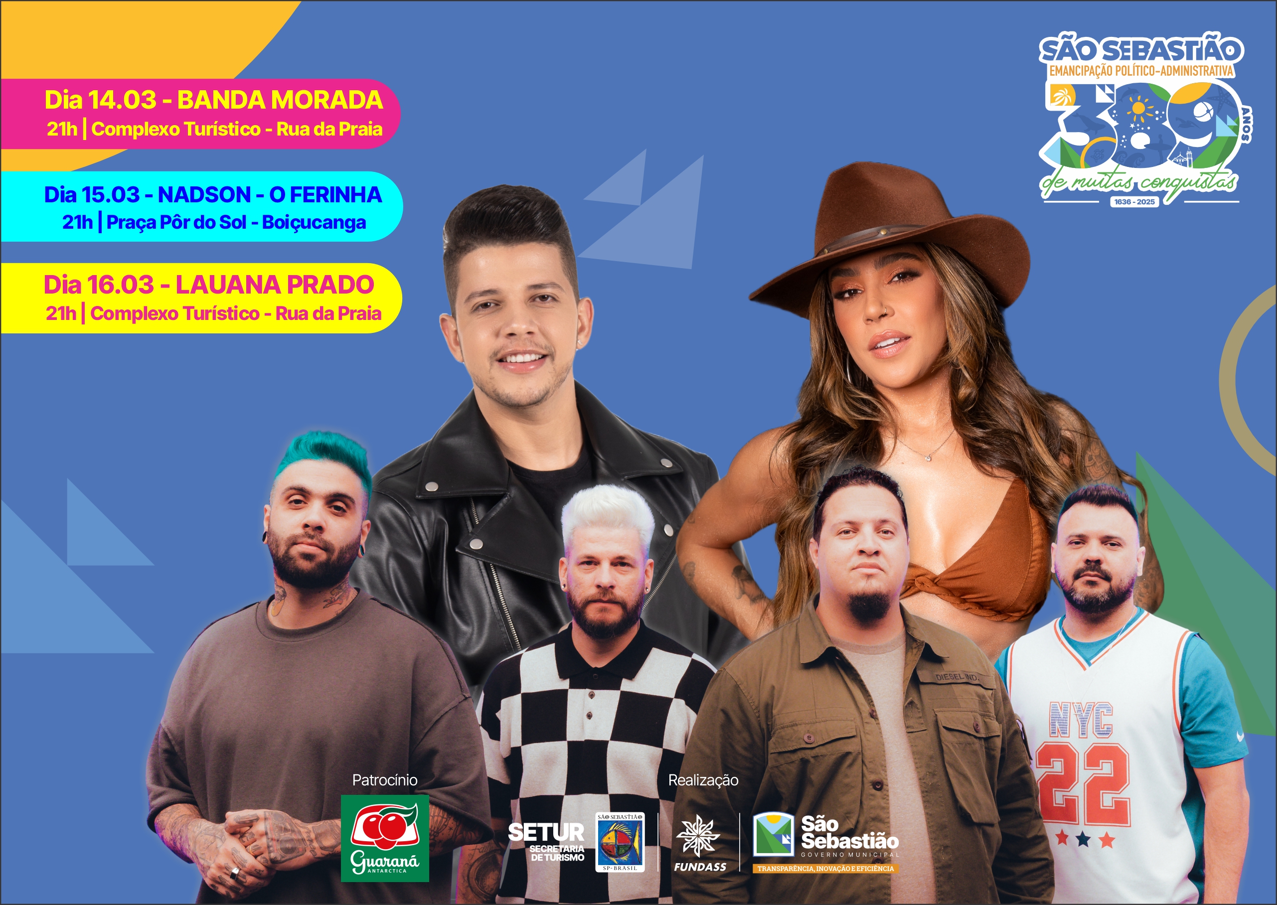 A Prefeitura de São Sebastião, por meio da Secretaria de Turismo (Setur) e da Fundação Educacional e Cultural ‘Deodato Sant’Anna’ (Fundass), com patrocínio da Ambev, preparou uma grande festa para celebrar os 389 anos de emancipação político-administrativa do município, comemorado em 16 de março. As comemorações contarão com shows gratuitos de grandes nomes da música nacional em diferentes pontos da cidade.