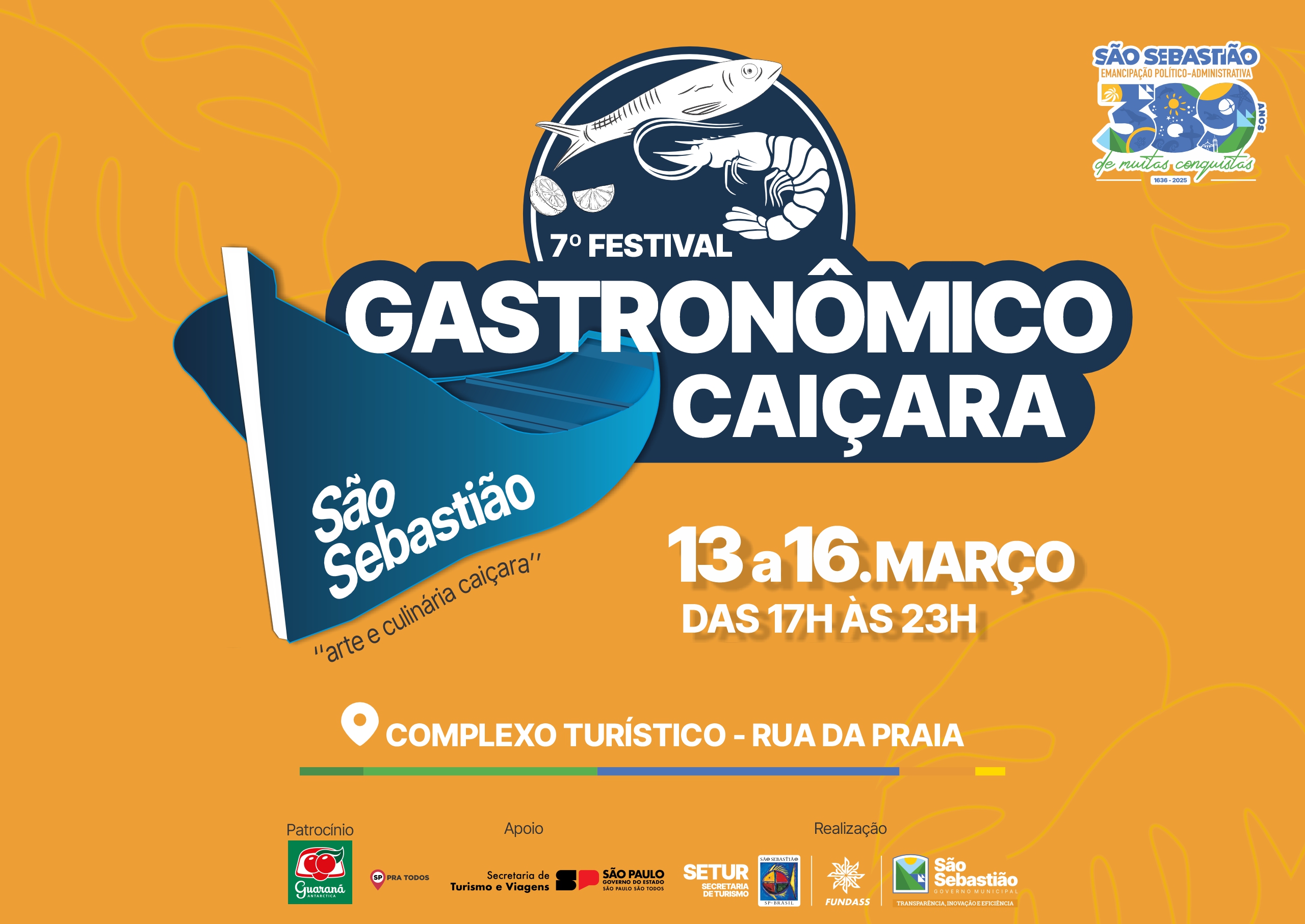 Do dia 13 ao dia 16 de março, o Complexo Turístico da Rua da Praia será palco da 7ª edição do Festival Gastronômico Caiçara de São Sebastião, evento promovido pela Prefeitura de São Sebastião, por meio da Secretaria de Turismo (Setur) e da Fundação Educacional e Cultural ‘Deodato Sant’Anna’ (Fundass), em parceira da Secretaria de Turismo e Viagens do Estado de São Paulo.