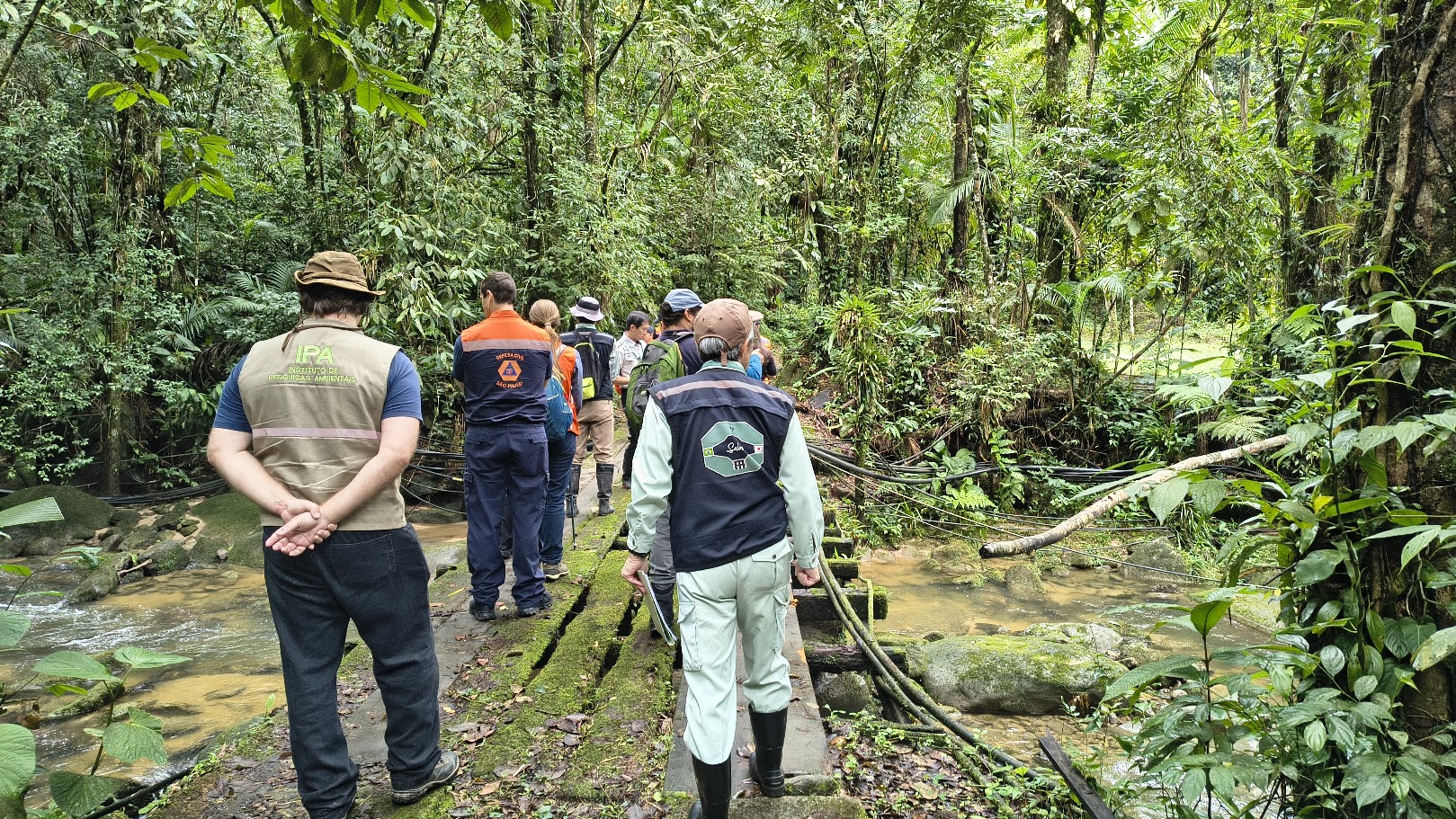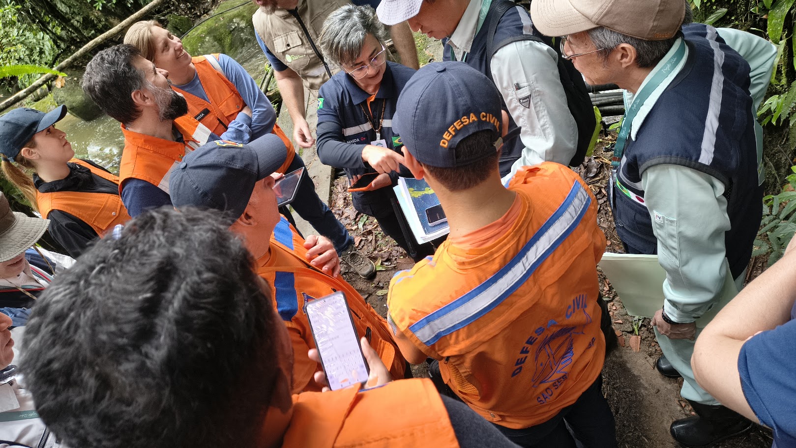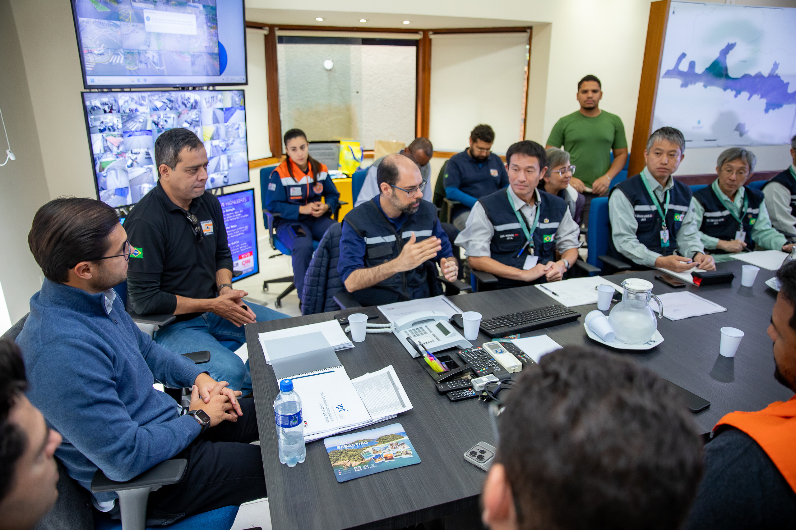 #PraTodosVerem: Na primeira imagem, o prefeito Reinaldinho está reunido com engenheiros do Japão, Defesas Civis de São Sebastião, de São Paulo e Nacional. Eles usam coletes e uniformes, alguns com bandeiras do Brasil e Japão. Estão em reunião, discutindo documentos e olhando para telas com câmeras de segurança. Depois o grupo de pessoas caminha por uma trilha próximo a um riacho. Estão uniformizados, com coletes de Defesa Civil e órgãos ambientais. Na terceira imagem, o grupo analisa mapas e dados técnicos em tablets e papéis, em meio à Mata Atlântica. Todos parecem atentos às explicações em um mapa. Por fim, aparece uma estrutura de contenção de concreto em meio a uma área verde. Trata-se de uma barragem do tipo “sabo”, utilizada para conter deslizamentos e fluxo de detritos. Fim da descrição.