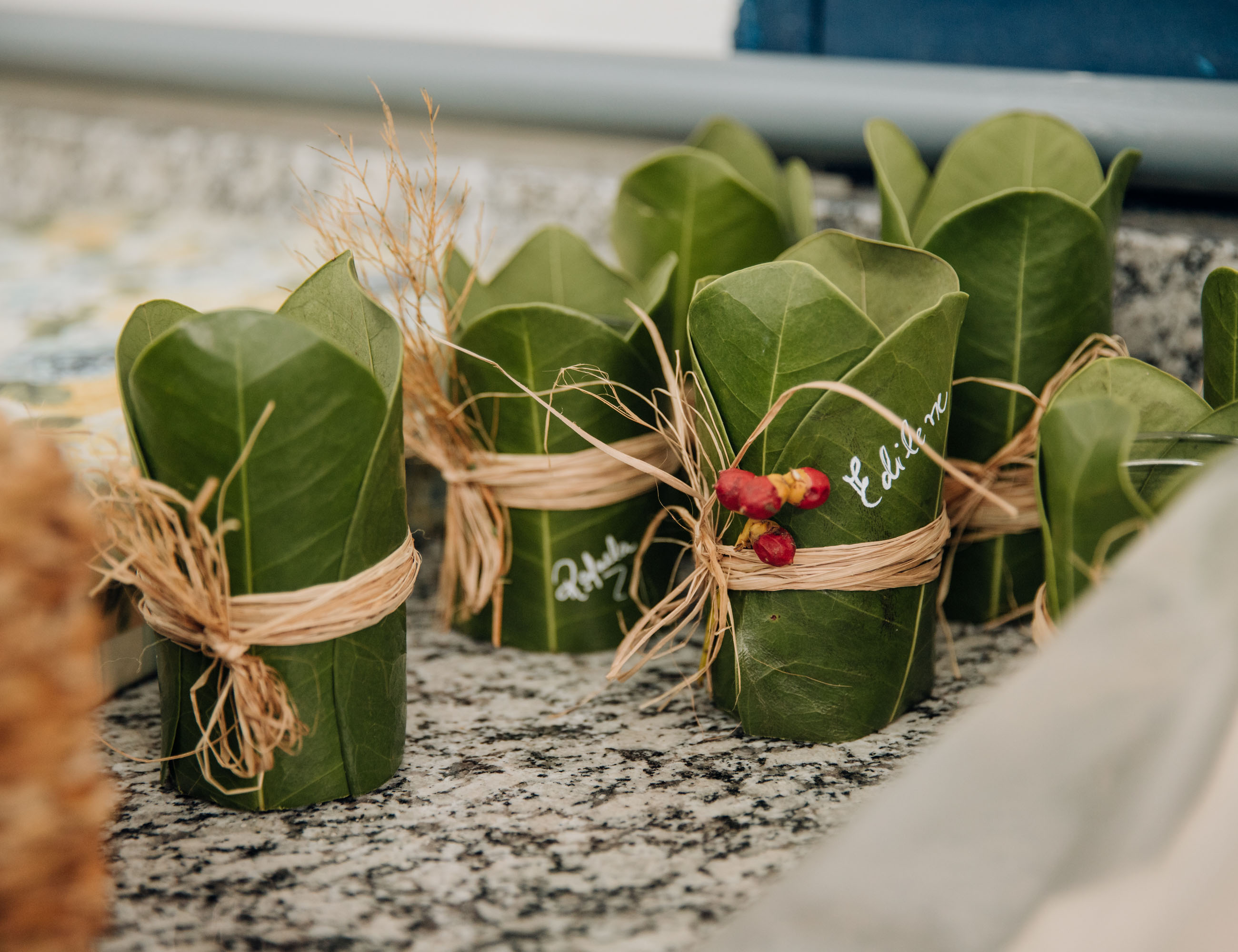 #ParaTodosVerem: Imagens mostram momentos de um workshop de mesa posta realizado em São Sebastião. A primeira foto destaca uma mesa decorada com jogos americanos de fibra, guardanapos de tecido dobrados de forma criativa, louças em tons terrosos e enfeites naturais, como folhas e frutos tropicais. A segunda imagem apresenta lembranças feitas com folhas verdes amarradas com fibras naturais, utilizadas como embalagens sustentáveis. Já na terceira foto, a instrutora do curso, sorridente, segura uma dessas peças enquanto explica a técnica para o grupo de participantes. Fim da descrição.