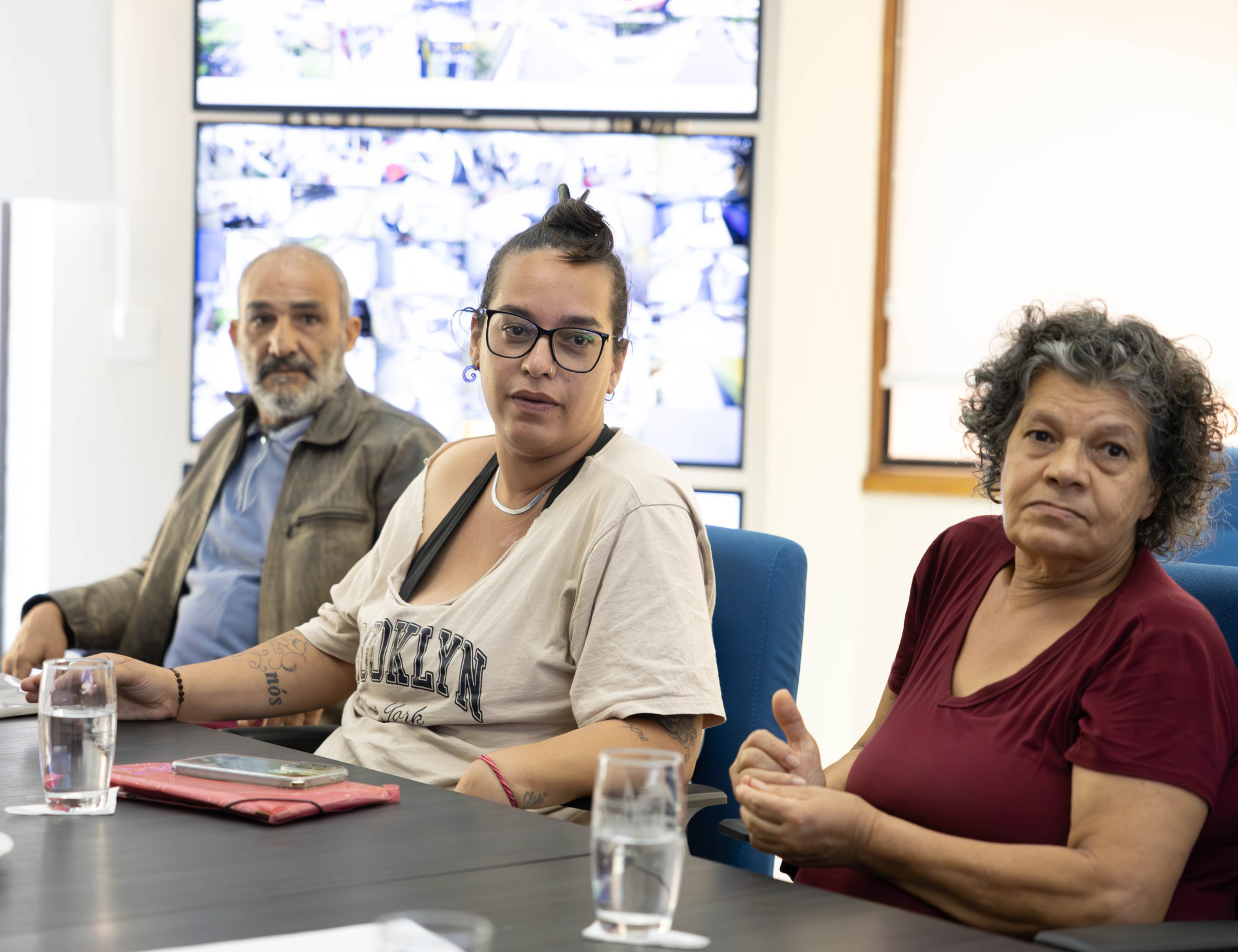#PraTodosVerem: As imagens mostram um grupo de treze homens e mulheres, de diferentes idades e vestimentas, em um encontro. A primeira foto é um registro em pé na frente de grandes telas de monitoramento. As outras fotos são close-ups da reunião ao redor de uma mesa escura, onde os participantes conversam ou ouvem atentamente. As telas de vigilância urbana são visíveis ao fundo em todas as imagens. Fim da descrição.