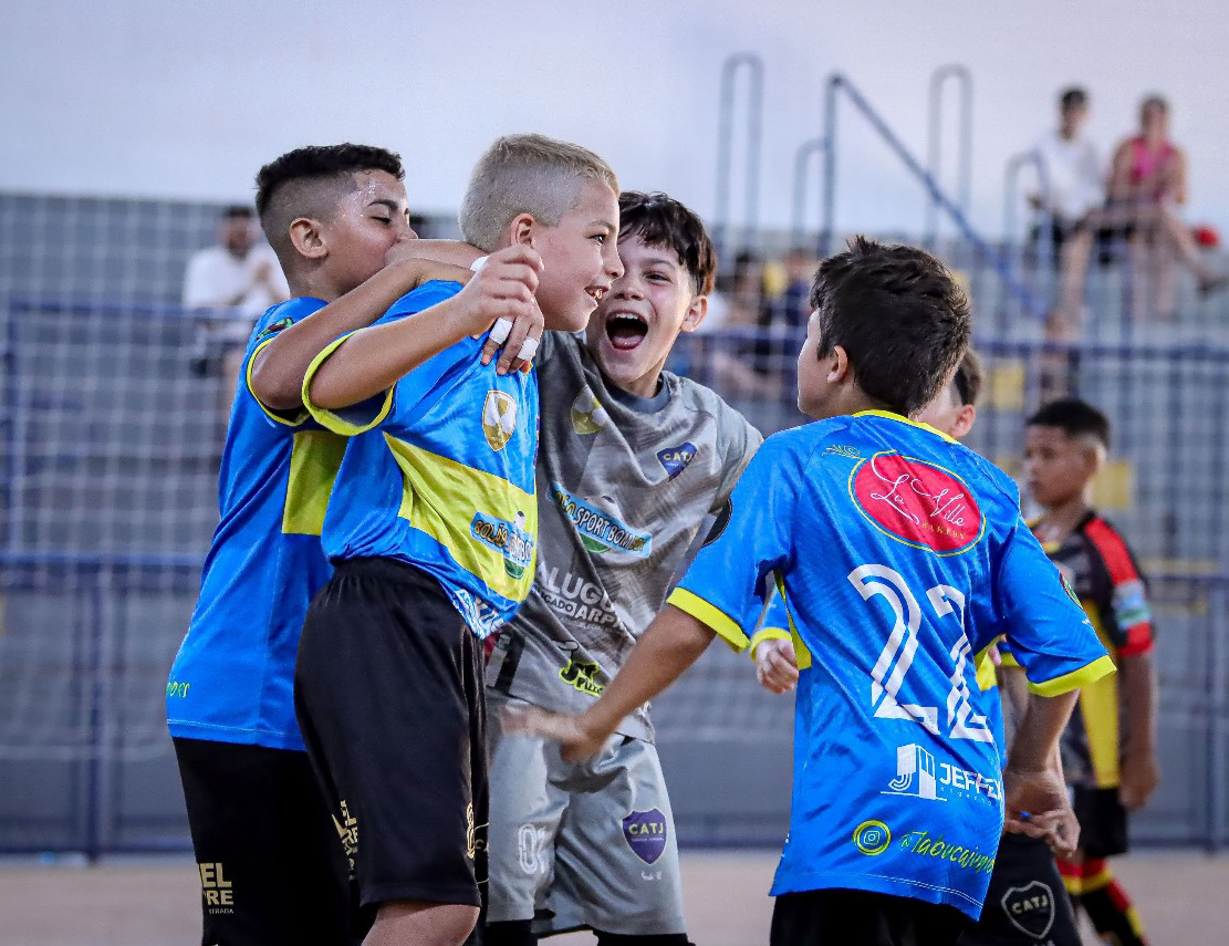 #PraTodosVerem: Nas imagens da Copa São Paulo de Futsal de Base, jovens atletas disputam intensamente a bola em quadra, com dois times em uniformes azul e amarelo-preto travando jogadas rápidas sob o olhar atento da torcida ao fundo, enquanto outra cena registra o momento de euforia após o jogo, com crianças abraçando-se próximas à grade e celebrando com familiares e colegas que vibram, sorriem e registram a comemoração, formando um ambiente de pura alegria esportiva e união. Fim da descrição.