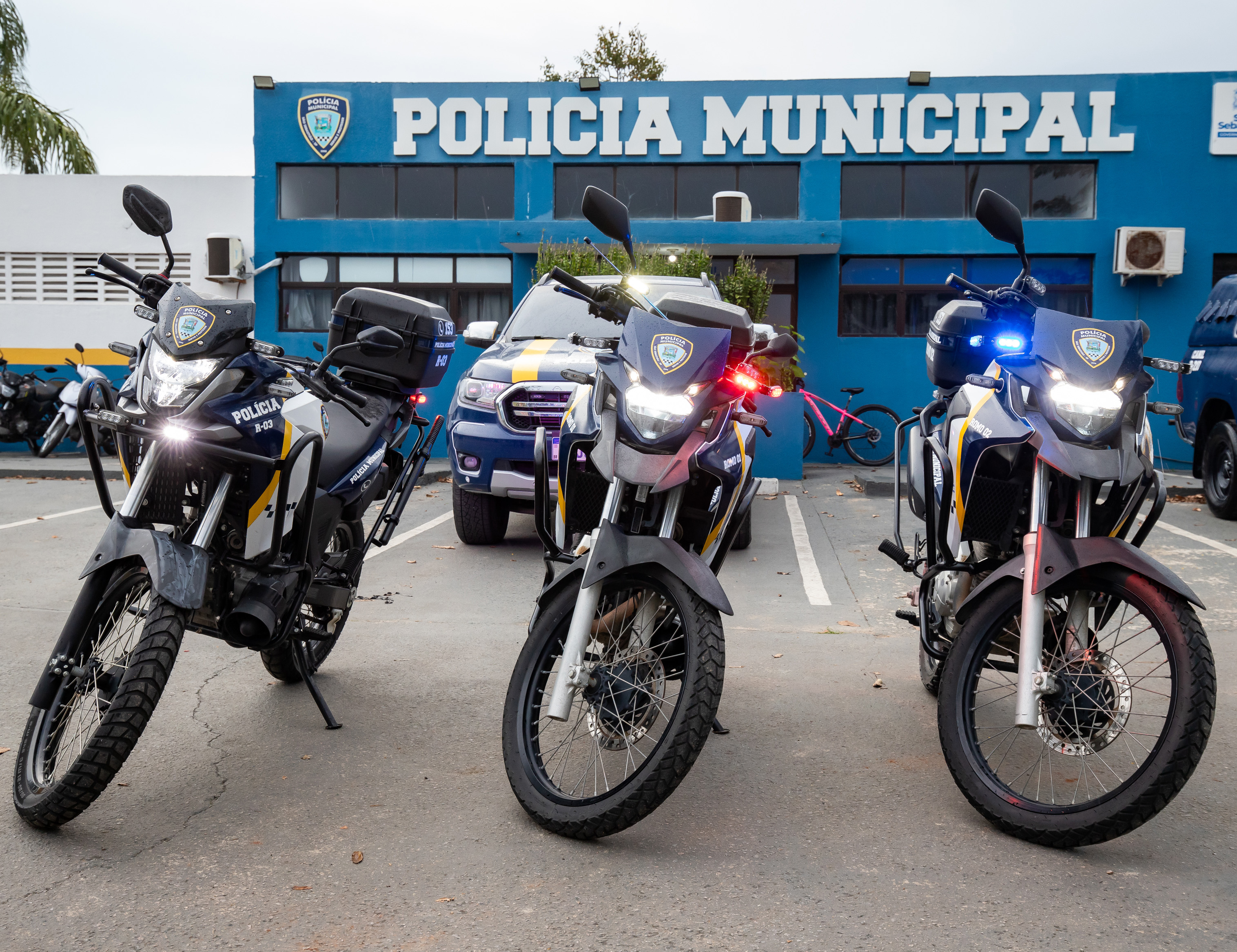 #PraTodosVerem: Viatura da Polícia Municipal estacionada em uma praça arborizada. Um agente uniformizado está em pé ao lado da porta aberta do veículo, enquanto outras pessoas aparecem ao fundo sentadas e caminhando pelo local. A cena ocorre em um dia claro, com árvores e prédios coloridos ao redor.