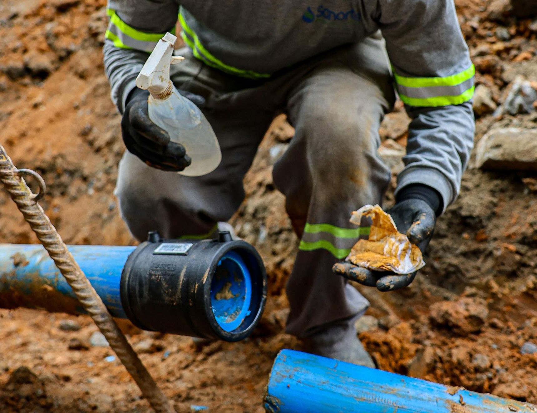 #PraTodosVerem: Equipes realizam obras de infraestrutura com maquinário pesado e trabalho técnico em área urbana, onde um operador conduz uma escavadeira enquanto outro trabalhador, utilizando equipamentos de proteção individual, como capacete, luvas e uniforme com faixas refletivas, executa a manutenção de tubulações subterrâneas. Em detalhes, profissionais cortam um tubo azul com serrote e preparam a conexão das peças, aplicando materiais de vedação e ajustando os encaixes em meio ao solo escavado, evidenciando o processo de reparo e instalação da rede de abastecimento. Fim da descrição.