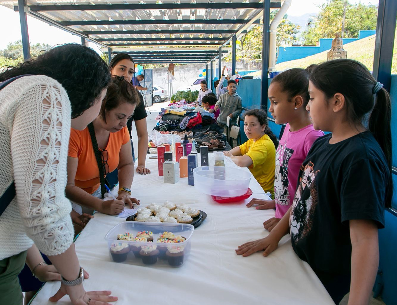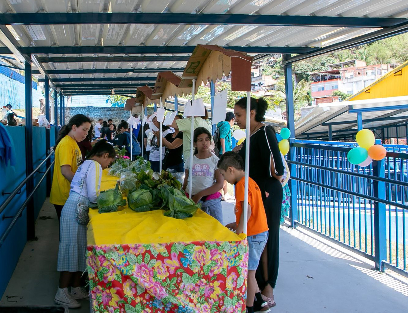 #PraTodosVerem: Sequência de fotos mostra jovens e crianças em uma feira de empreendedorismo escolar. Na primeira imagem, seis adolescentes sorriem atrás de uma mesa com perfumes artesanais, aromatizadores e um bolo. Na segunda, crianças observam uma banca de hortaliças frescas, como repolhos, sob uma cobertura metálica. Na terceira, adultos e crianças interagem em uma mesa com cupcakes e produtos em caixas, enquanto outras bancas ao fundo exibem roupas e calçados. O ambiente é aberto, iluminado pelo sol e decorado com balões coloridos. Fim da descrição.