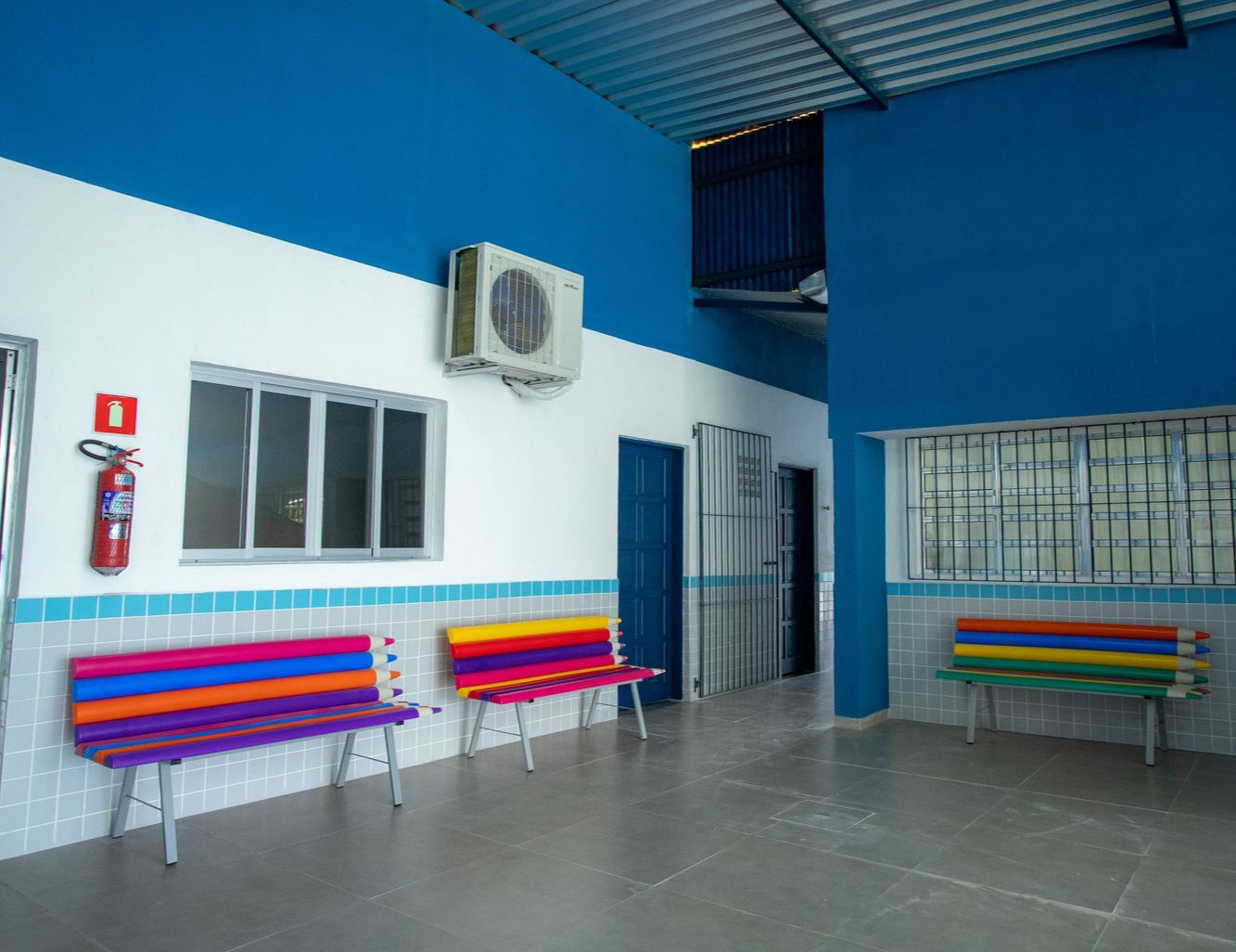 #PraTodosVerem: A primeira imagem mostra uma sala de aula ampla e iluminada, com mesas brancas e cadeiras laranjas organizadas, além de um ar-condicionado e ventilador instalados na parede branca com rodapé de azulejos cinzas. A segunda imagem apresenta um pátio escolar com paredes azuis e brancas, exibindo bancos coloridos em formato de lápis, um extintor de incêndio e a unidade externa de um ar-condicionado fixada acima de uma janela de vidro. Fim da descrição.