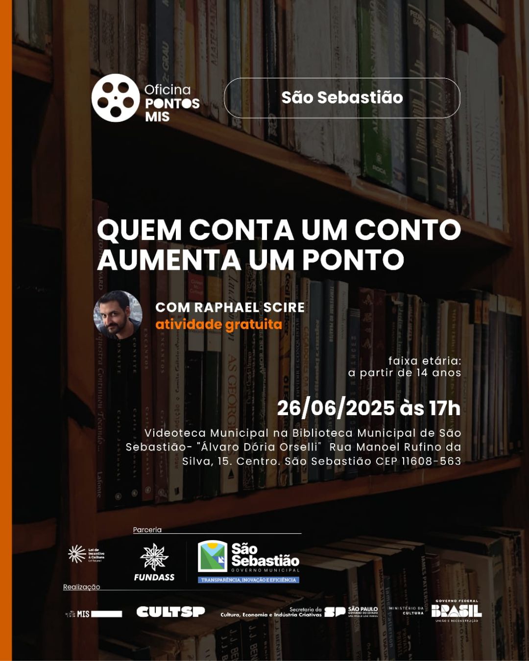 A Prefeitura de São Sebastião, por meio da Fundação Educacional e Cultural ‘Deodato Sant’Anna’ (Fundass), em parceria com a Secretaria de Cultura e Economia Criativa do Governo do Estado de São Paulo e o Pontos MIS, oferece, gratuitamente, no dia 26 de junho (quinta-feira), a Oficina ‘Quem conta um conto aumenta um ponto’, ministrada pelo jornalista e dramaturgo Raphael Scire.