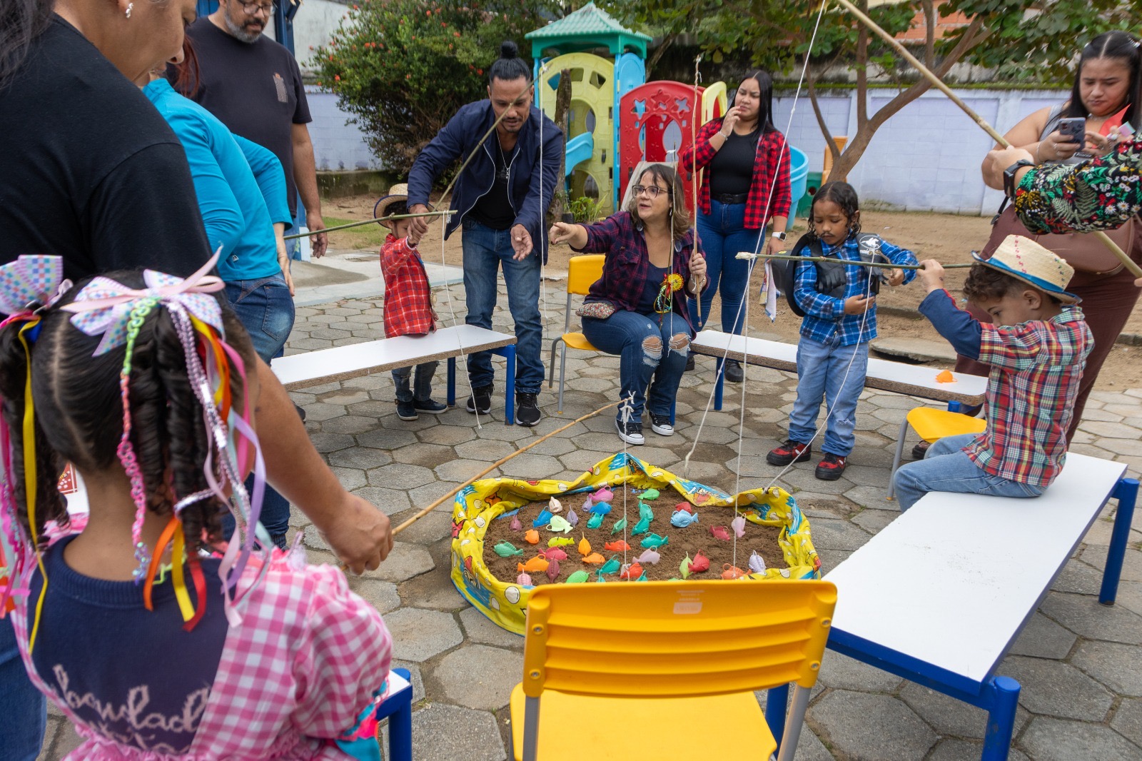 #PraTodosVerem: imagens mostram momentos da Festa da Cultura Popular em escolas da rede municipal de São Sebastião. Na primeira foto, crianças caracterizadas com trajes típicos apresentam uma dança no palco decorado com bandeirinhas coloridas, cenário junino e desenhos representando o interior do Brasil. Na segunda imagem, famílias e estudantes lotam o pátio da escola, decorado com bandeirinhas, onde mesas coloridas estão dispostas para confraternização. Na terceira, adultos e estudantes circulam por barracas decoradas com papel colorido. Na última imagem, crianças pequenas participam da tradicional brincadeira de pescaria, acompanhadas por familiares, em um espaço externo. Fim da descrição.