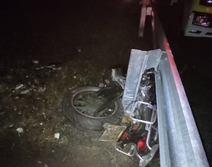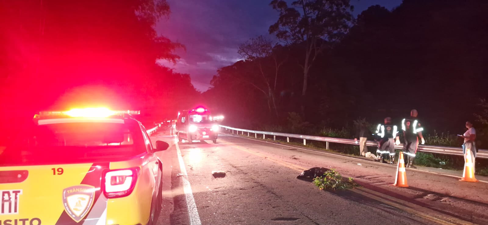 #PraTodosVerem: fotografia noturna de um acidente de trânsito na rodovia. Na cena há um carro da fiscalização de trânsito com as luzes de emergência acesas em primeiro plano à esquerda. No fundo, uma ambulância com luzes vermelhas acesas e vários socorristas atendendo à ocorrência na pista, onde há cones de sinalização e alguns galhos no asfalto. À direita, pessoas e socorristas próximos ao guarda-corpo. A estrada está parcialmente iluminada pelas luzes dos veículos de emergência. Em outra imagem o carro está parado atravessado sobre a faixa da rodovia. No fundo, luzes vermelhas dos veículos de resgate iluminam a cena, com cones de sinalização visíveis. Por fim, uma motocicleta acidentada caída fora da pista, parcialmente debaixo do guarda-corpo de metal. A moto está bastante danificada, com a roda traseira visível e a placa identificadora presa. O local está iluminado pelo farol de um veículo de resgate. Fim da descrição.