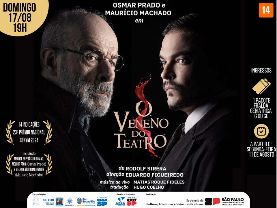 O aclamado espetáculo ‘O Veneno do Teatro’, estrelado pelos atores globais Osmar Prado e Maurício Machado, será apresentado no dia 17 de agosto (domingo), às 19h, no Teatro Municipal de São Sebastião.