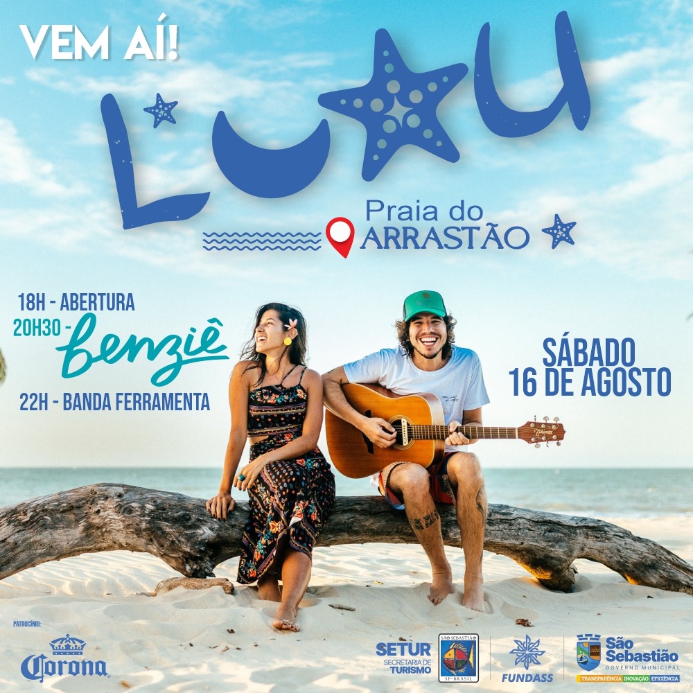 #PraTodosVerem: Card do evento “Luau Arrastão”. No topo, o texto “Vem aí! Luau Praia do Arrastão” com uma estrela-do-mar no lugar da letra “a”. Abaixo, os horários: 18h Abertura, 20h30 Benziê, 22h Banda Ferramenta. À direita, a data: sábado, 16 de agosto. No centro, um homem com violão e uma mulher de vestido longo sentam-se sorrindo sobre um tronco na areia. Ao fundo, céu azul. Rodapé com logomarcas de patrocinadores e apoiadores. Fim da descrição.