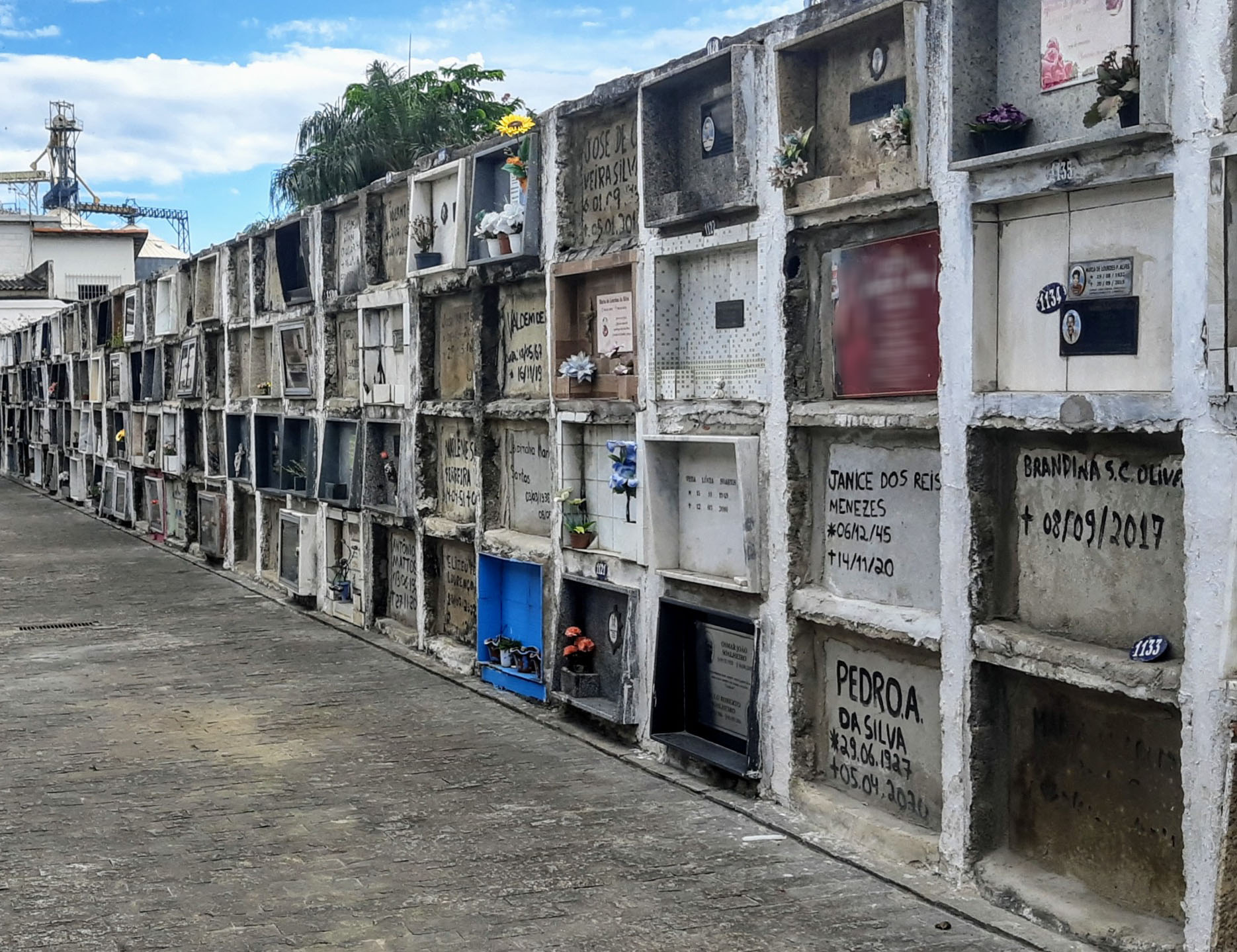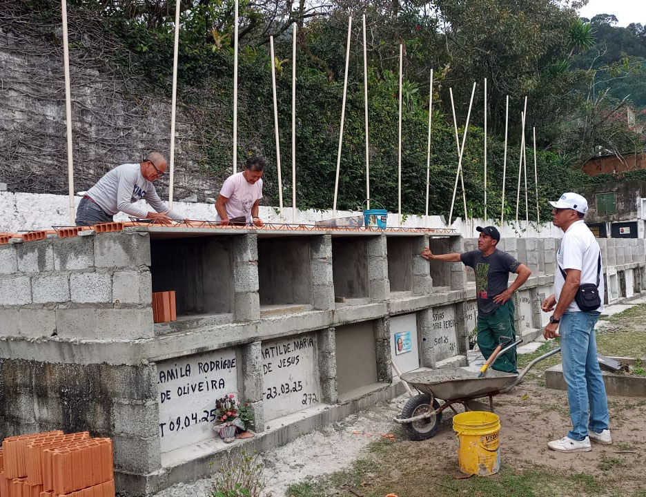 #ParaTodosVerem: As imagens mostram o trabalho da Prefeitura de São Sebastião nos cemitérios municipais. A primeira foto registra uma fileira de gavetas mortuárias já ocupadas, com flores e placas de identificação. As fotos seguintes retratam a construção de novos jazigos, com pedreiros trabalhando na estrutura de concreto e tijolos. A última imagem mostra a fachada do Velório Municipal, pintado em branco e azul, com bancos na área externa e plantas ornamentais. Fim da descrição.