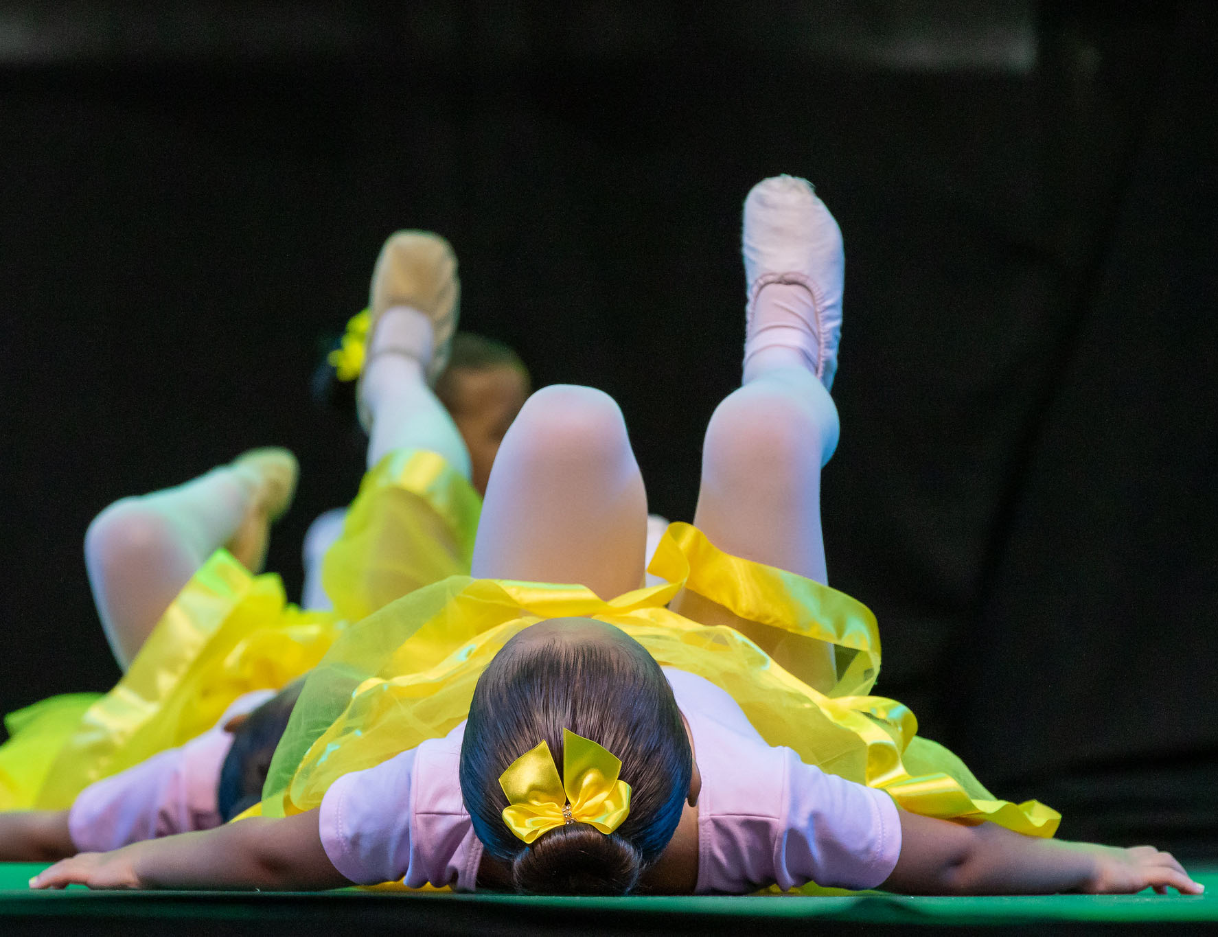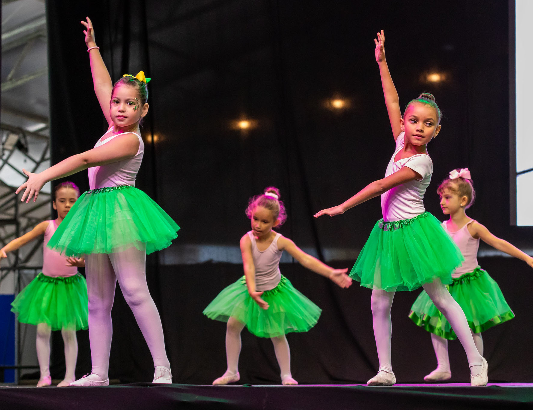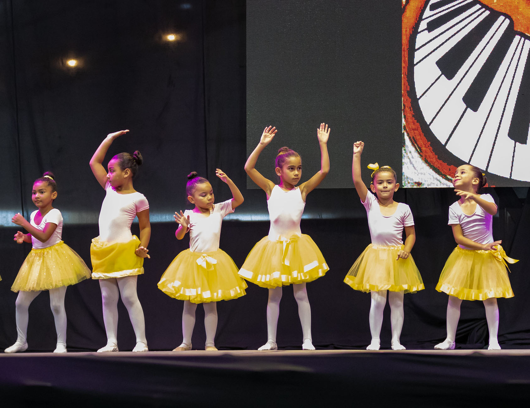 #PraTodosVerem: Sequência de fotos mostra crianças pequenas se apresentando em um palco de dança. Elas usam collant branco, meia-calça e sapatilhas, com saias de tule coloridas — verdes em algumas coreografias e amarelas em outras. Nos cabelos, laços combinam com as cores das saias. Em fila ou em grupos, as crianças realizam diferentes movimentos de balé, como poses com os braços erguidos, giros e passos coordenados. Em uma das imagens, aparecem deitadas no chão com as pernas levantadas. Ao fundo, há painéis iluminados com desenhos e elementos artísticos, compondo o cenário da apresentação.
