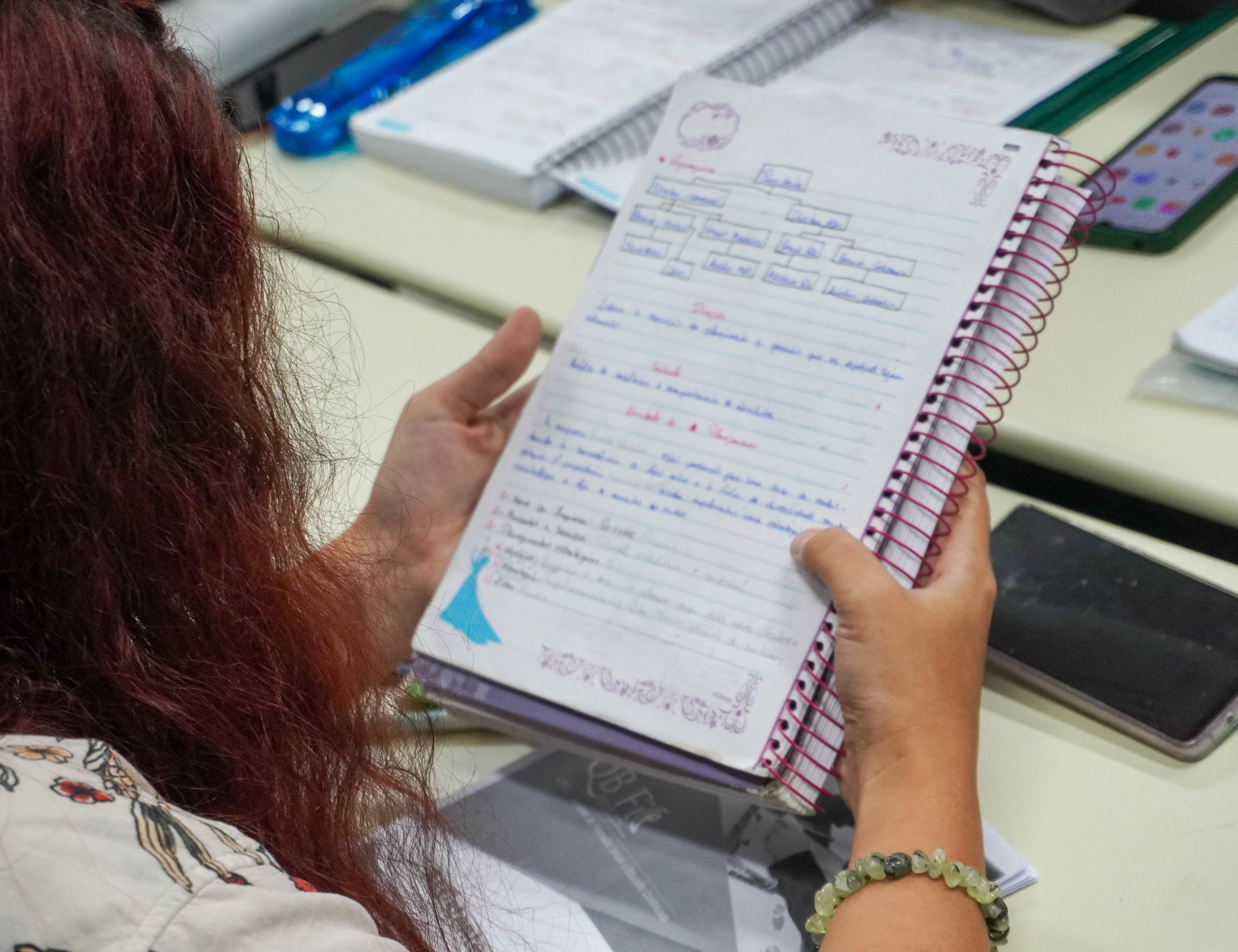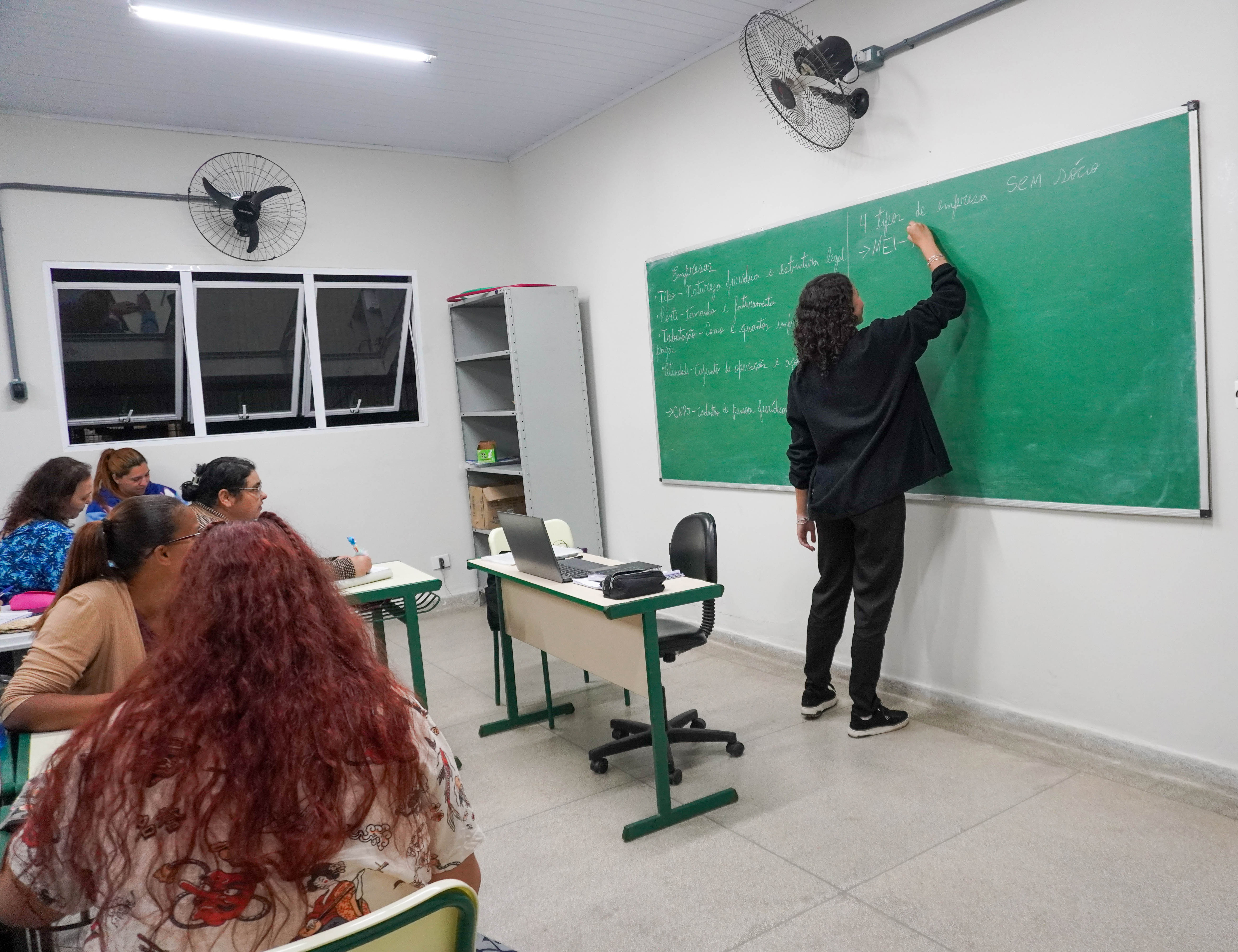 #Pratodosverem em uma sala de aula, estudantes participam de uma aula do curso profissionalizante. Em uma das imagens, uma pessoa segura um caderno com anotações organizadas e coloridas, enquanto acompanha o conteúdo. Na outra, a turma observa a professora escrevendo no quadro verde sobre os tipos de empresas, enquanto fazem anotações e participam atentamente da atividade. Fim da descrição.