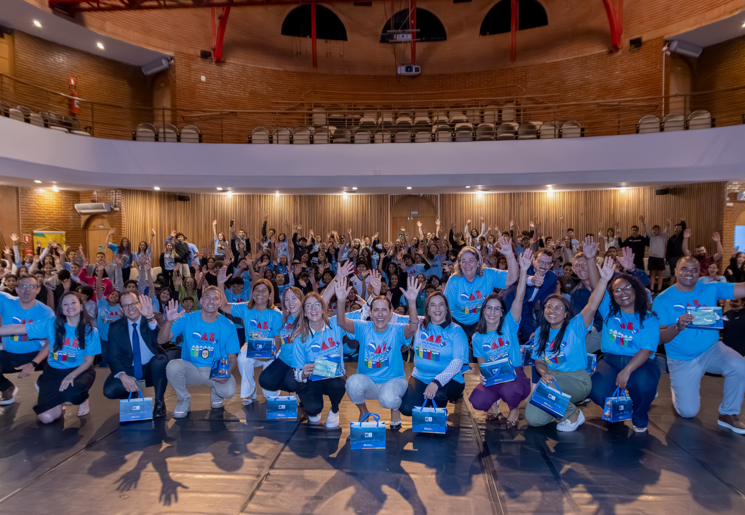#PraTodosVerem: As imagens documentam o evento de encerramento ou premiação do ‘Projeto OAB Vai à Escola’ e do “Programa Cidadania e Justiça também se aprendem na escola”, realizado em um auditório. As fotos mostram os estudantes, a maioria vestindo camisetas azuis claras, e os organizadores, incluindo advogados, em momentos de celebração: posando no palco com certificados, prestando uma homenagem solene com a mão no peito, e interagindo com uma plateia lotada de jovens aplaudindo e com as mãos levantadas, evidenciando o sucesso do projeto. Fim da descrição.