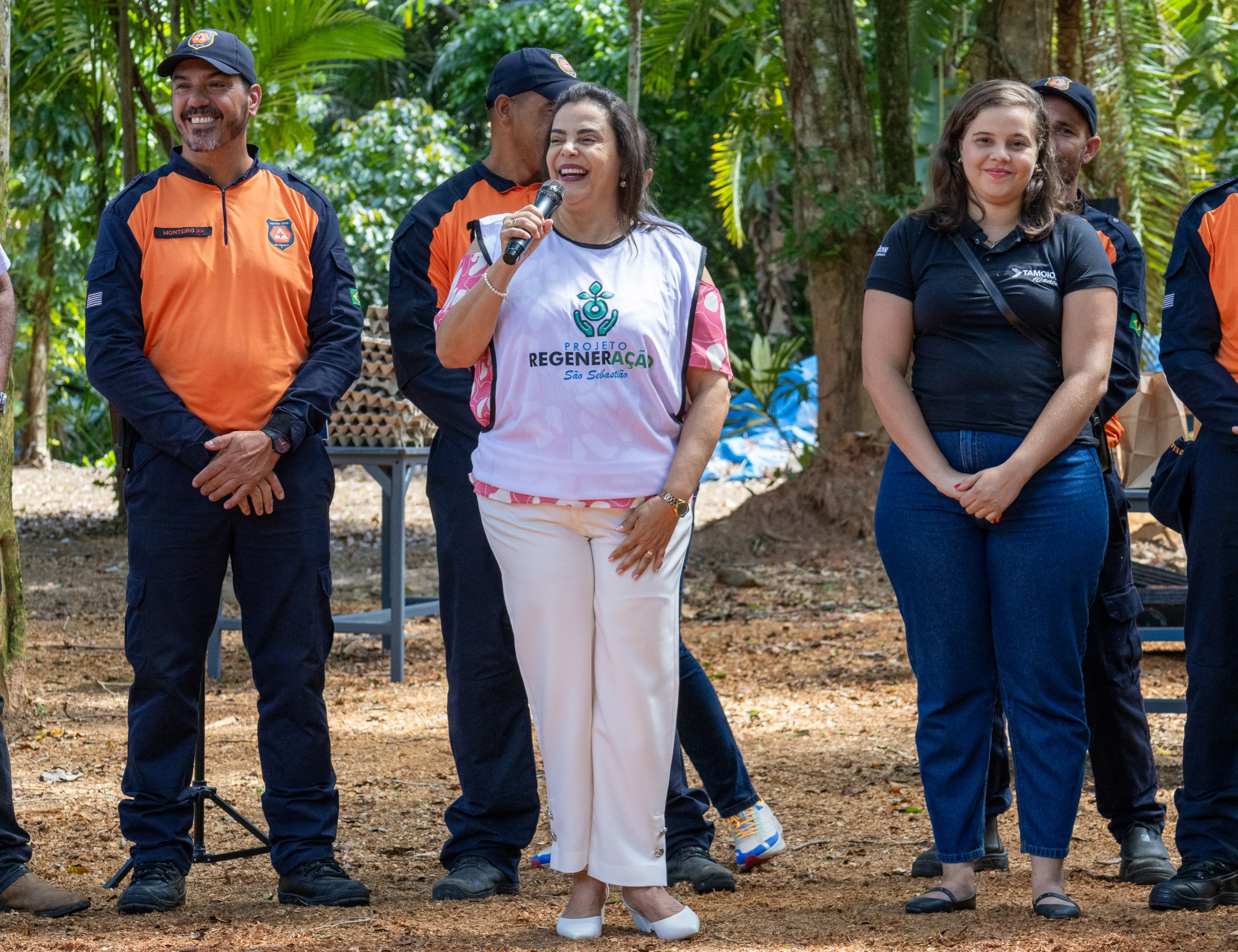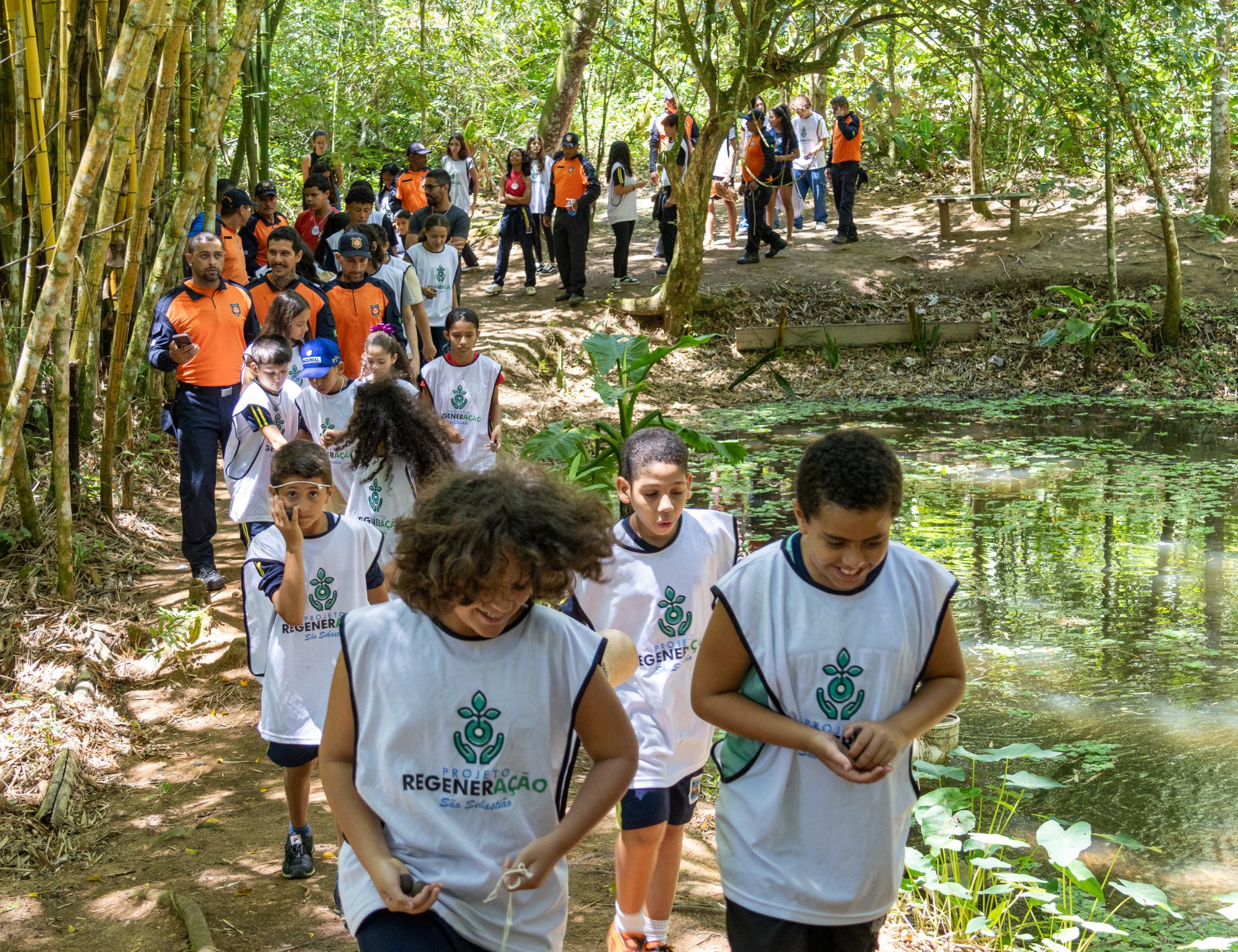 #PraTodosVerem: Quatro imagens capturam uma jornada ecológica em uma área de mata. O evento inclui um grupo de crianças e adultos, alguns vestindo coletes do "Projeto Regeneração", caminhando em trilhas e à beira de um lago. Há um foco em atividades práticas, com participantes manuseando terra e sementes. O grupo se reúne em uma grande foto coletiva em uma clareira. Há também um momento formal com discursos, onde uma mulher fala ao microfone, ladeada por pessoas em uniformes (laranja e azul-marinho). Fim da descrição.