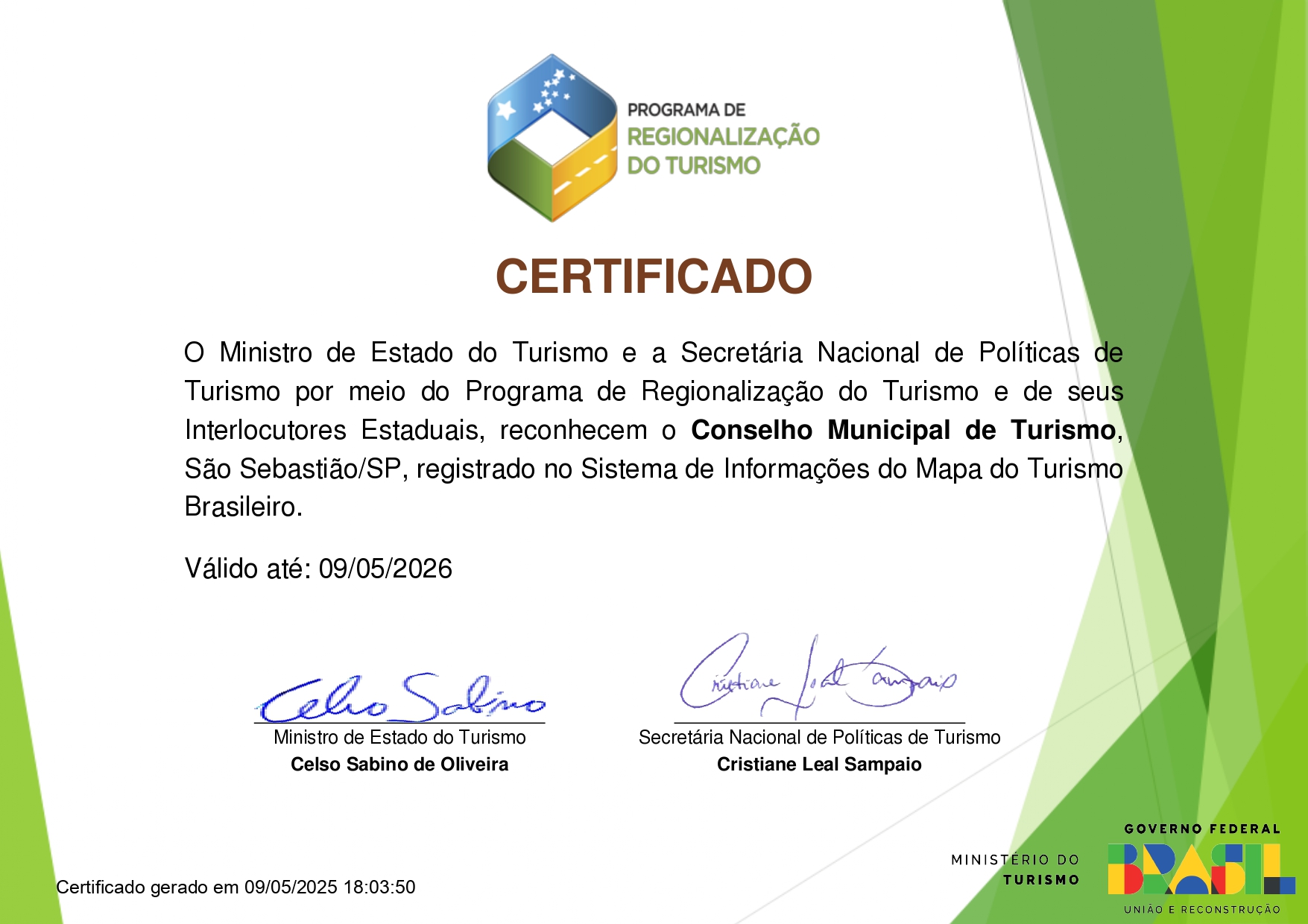 Além disso, o Conselho Municipal de Turismo de São Sebastião (Comtur) também foi reconhecido e registrado no SISMapa. “É um marco de grande relevância que reforça a legitimidade, a atuação estratégica e o protagonismo do órgão na condução das políticas públicas voltadas ao turismo.”, ressaltou o secretário de turismo, Leandro Pereira.