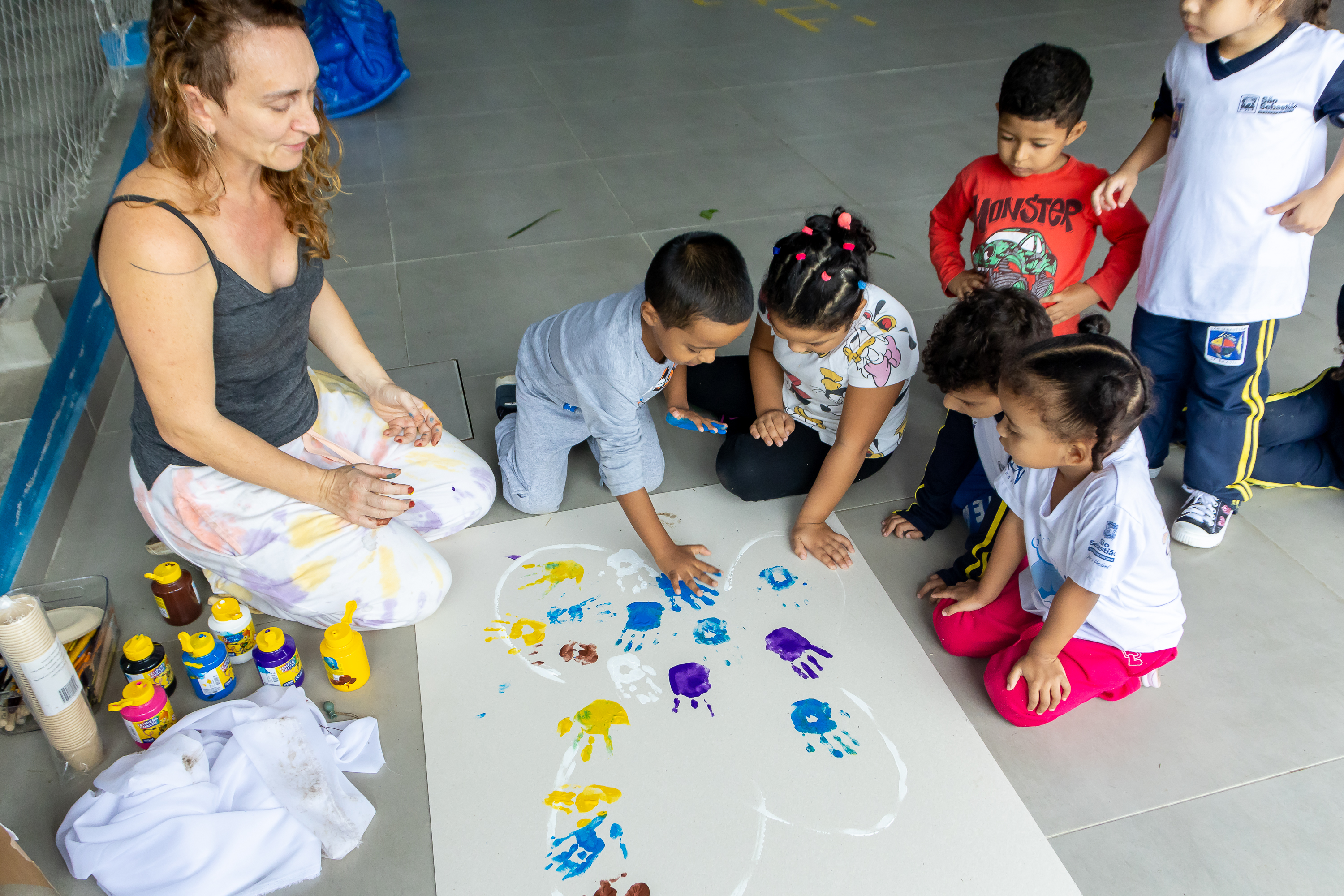 #PraTodosVerem: sequência de fotos mostra crianças da rede municipal participando do Projeto RegenerAção. Na primeira imagem, os alunos estão sentados em roda, ao ar livre, ouvindo uma contação de histórias conduzida por duas facilitadoras. Em seguida, as crianças observam e cheiram flores, explorando elementos naturais. Já nas últimas imagens, elas aparecem criando uma grande borboleta coletiva com tinta e carimbos de mão, enquanto interagem com as facilitadoras de forma lúdica e atenta. Fim da descrição.