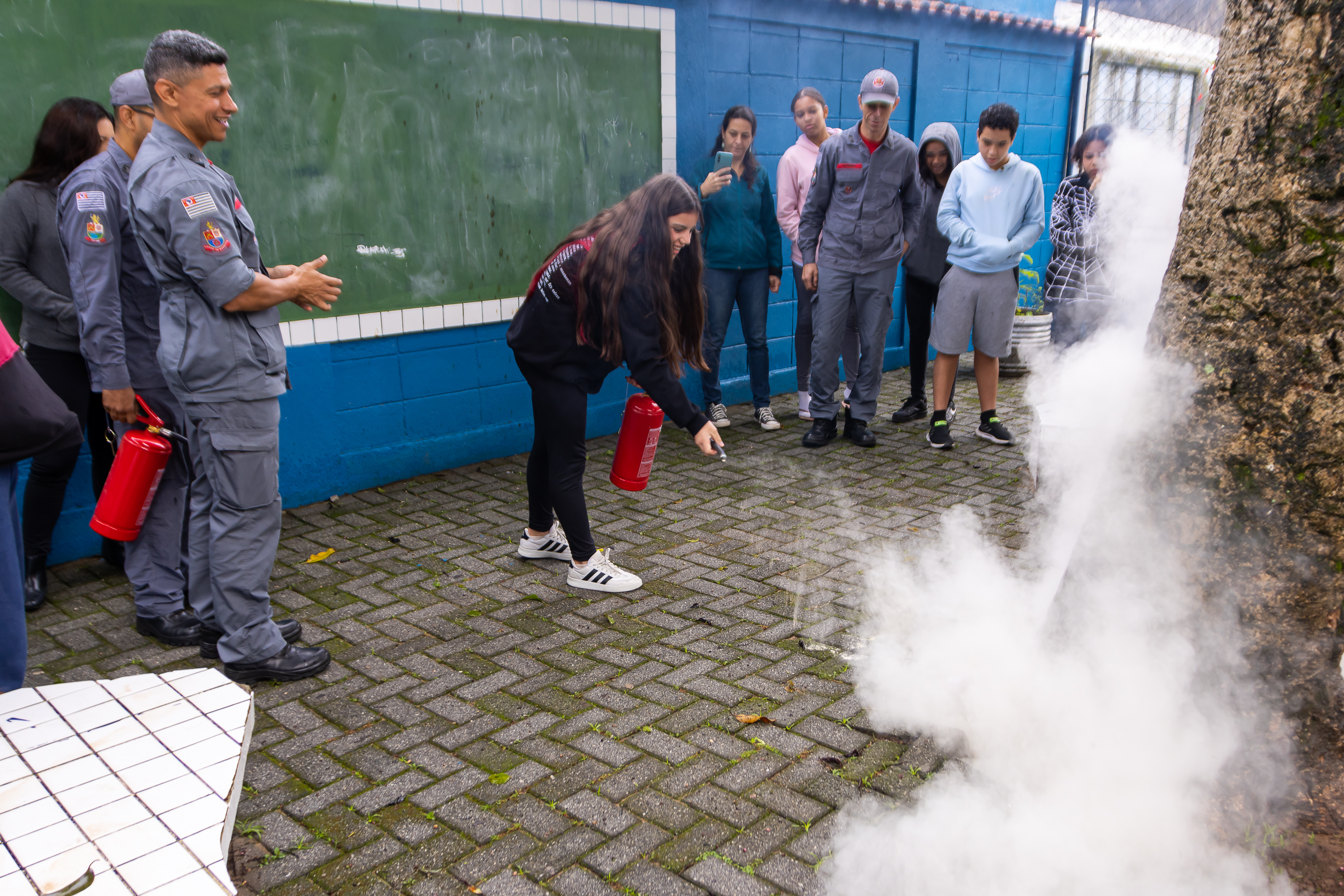 Nesta fase, os alunos vivenciaram uma capacitação prática sobre técnicas de combate a incêndio, com destaque para o uso correto de extintores. A atividade despertou o interesse dos estudantes, que participaram ativamente e demonstraram engajamento com o tema.