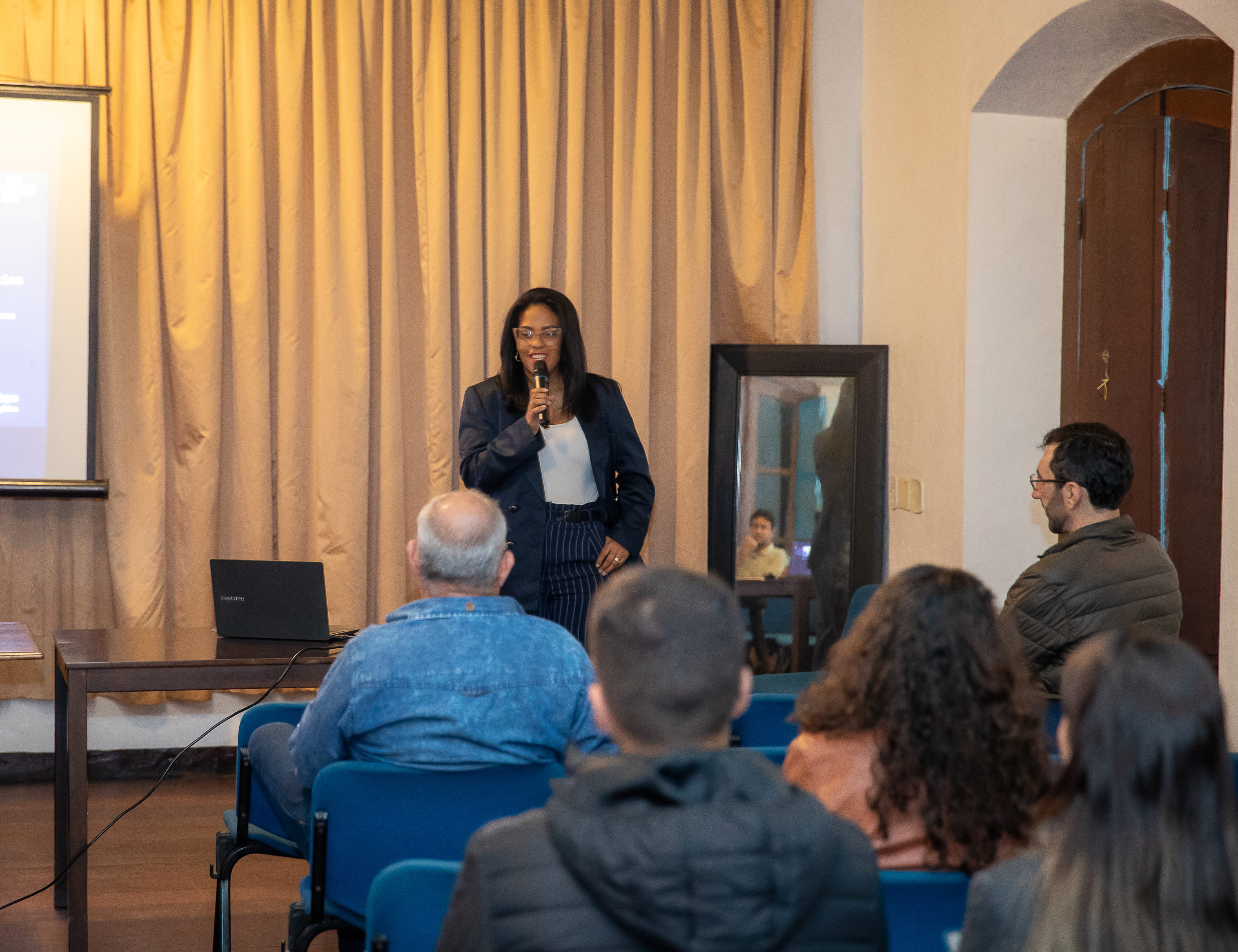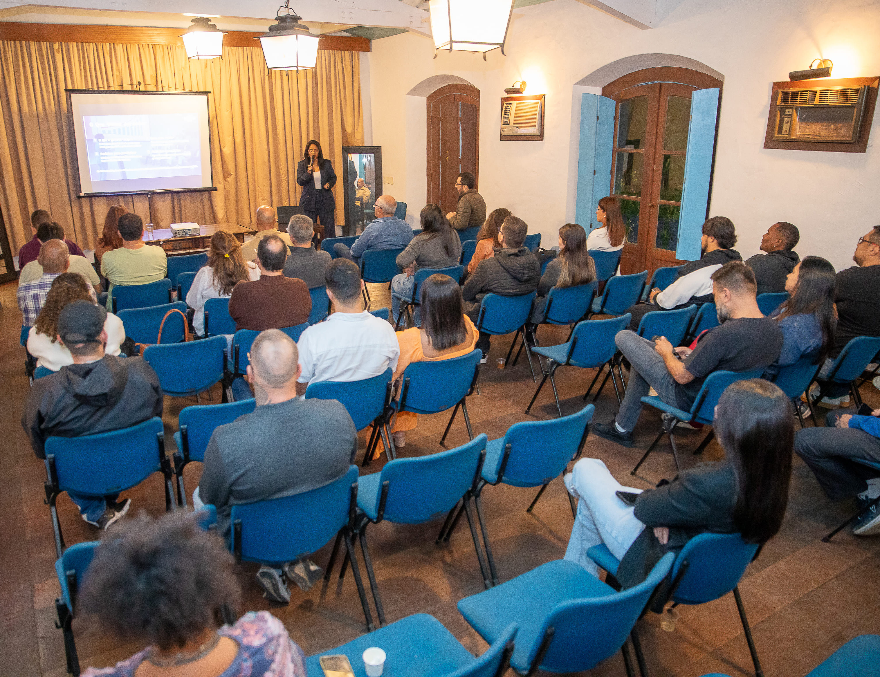 #PraTodosVerem: #PraTodosVerem: Imagens mostram uma atividade educativa sobre compras públicas. Em um auditório com cadeiras azuis, pessoas assistem a uma apresentação projetada em tela, com uma mulher falando ao microfone. A iluminação é aconchegante e o ambiente tem teto de madeira aparente. Fim da descrição.