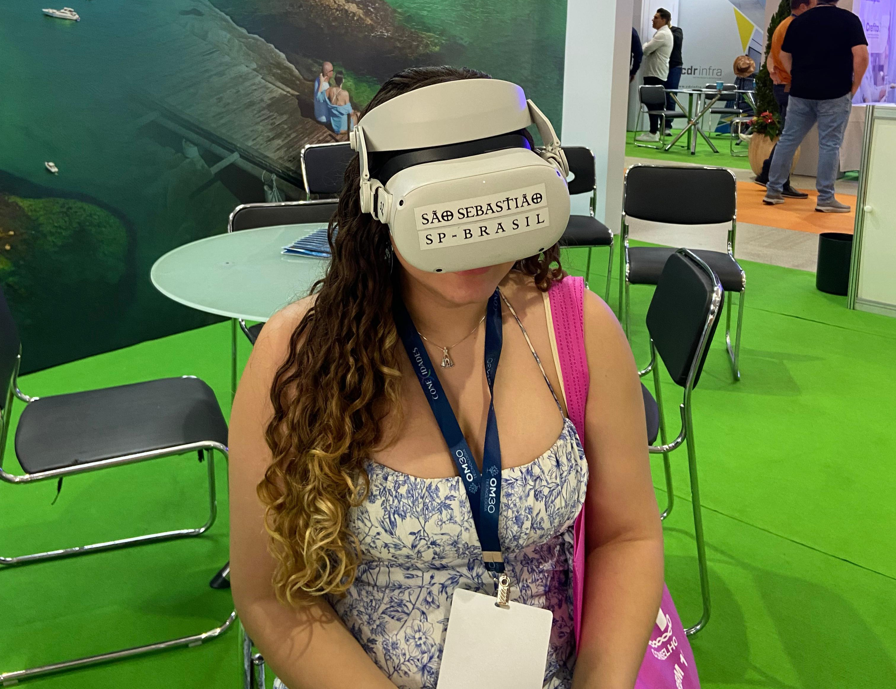 #PraTodosVerem: Sequência de fotos mostra o estande de São Sebastião no evento Conexidades. Pessoas interagem com materiais turísticos, folhetos e um livro sobre a cidade. Uma mulher experimenta óculos de realidade virtual com a marca “São Sebastião SP – Brasil”. Em outra imagem, autoridades e visitantes conversam no local. Fim da descrição.