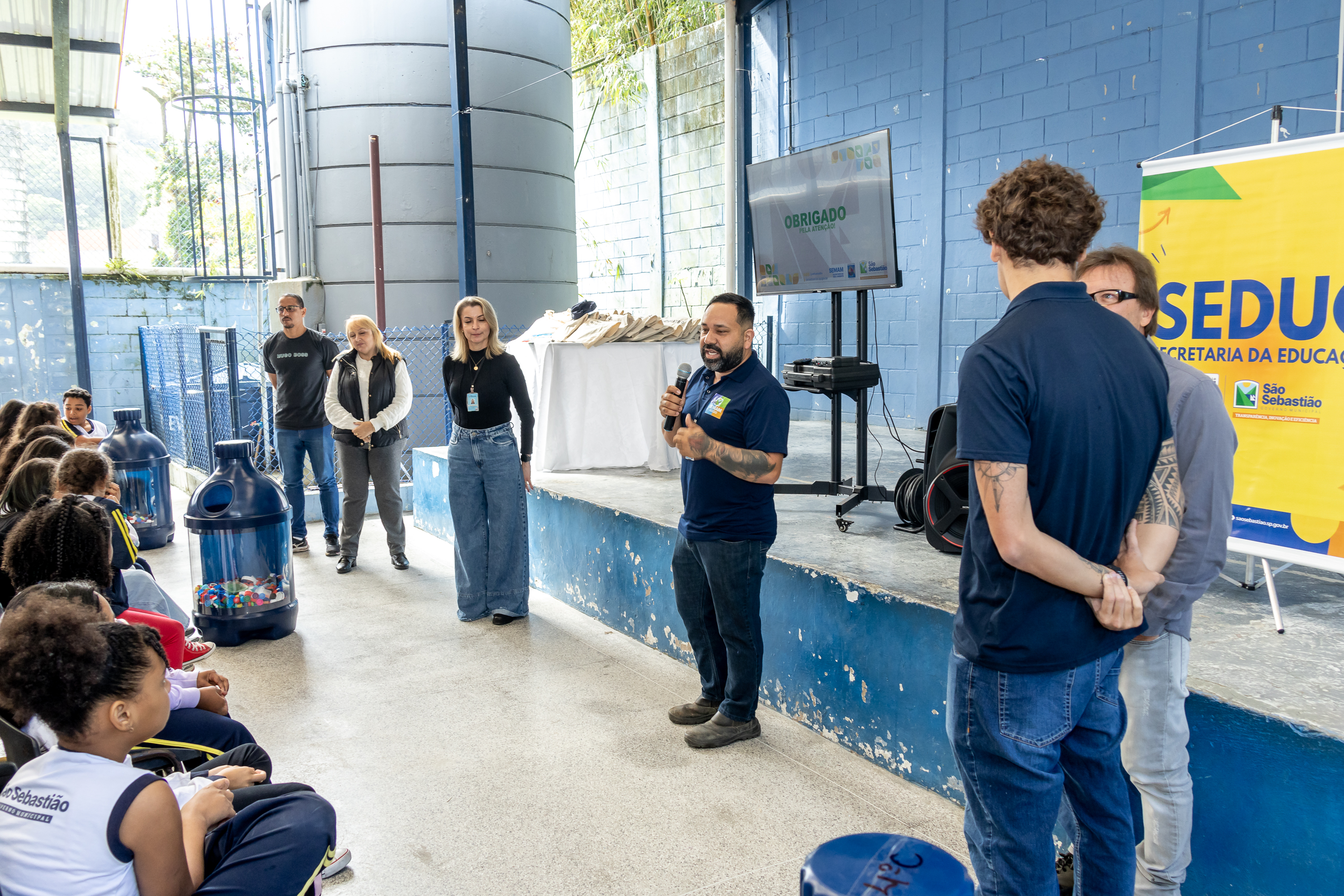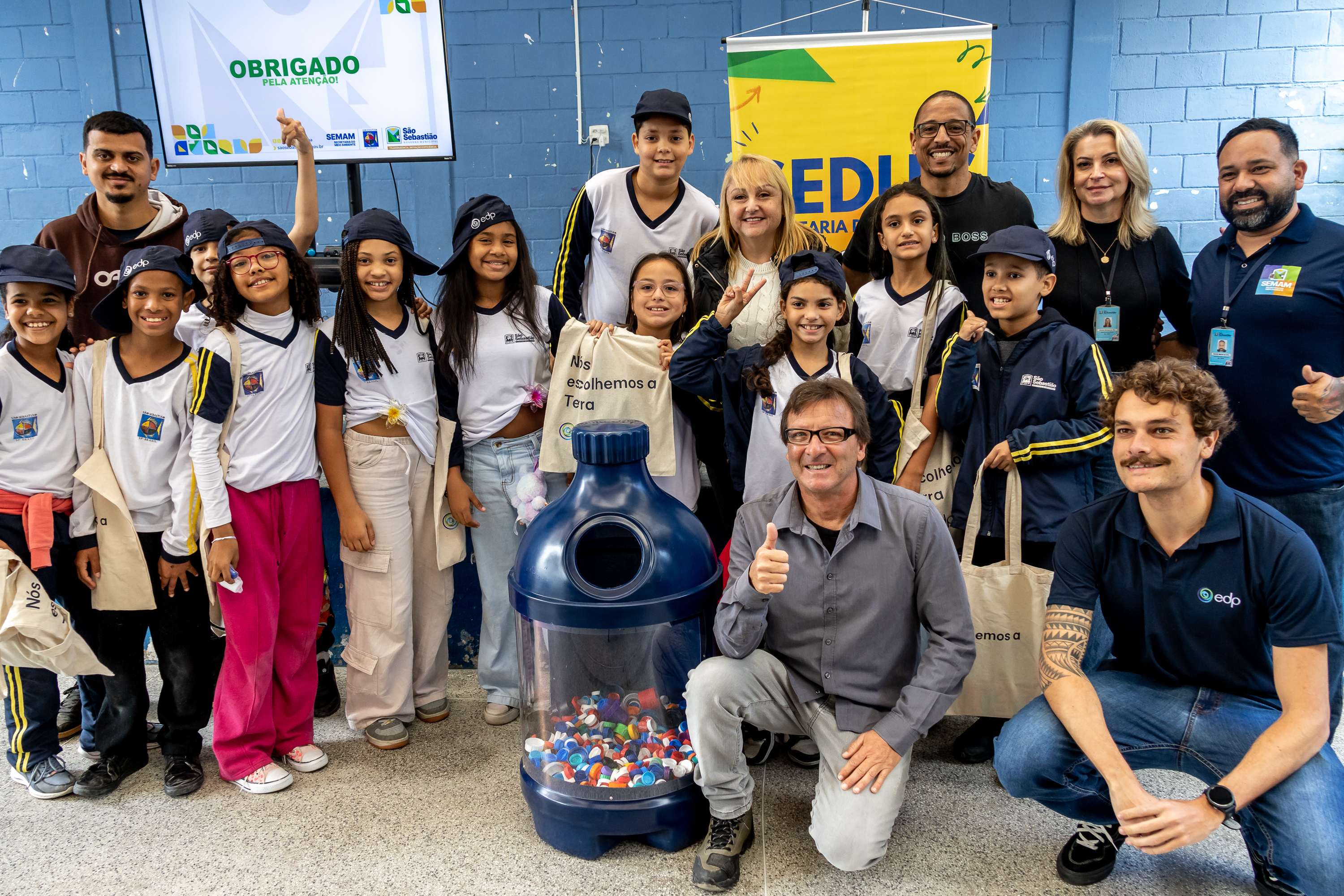 #PraTodosVerem: Sequência de quatro fotos mostra momentos da palestra do ‘EDP Circuito de Surf Colegial 2025’. Na primeira imagem, um grupo de crianças sentadas em cadeiras voltadas para um pequeno palco; na frente, cinco adultos alinhados, enquanto um homem mais jovem gesticula e fala. Na segunda imagem, um homem com microfone explica algo para os alunos; ao lado dele estão outros profissionais, duas mulheres e dois homens, observando. À esquerda, duas grandes urnas/recipientes azuis transparentes com tampinhas plásticas visíveis dentro. A terceira foto mostra um close de um homem segurando uma balança/dinâmometro digital preso a uma urna transparente cheia de tampinhas de garrafa pet coloridas; ao lado está a tampa da urna no chão. A imagem mostra a ação de medir/pesar a coleta de tampinhas. Por fim, crianças e os adultos organizadores posam sorridentes ao redor da urna azul com tampinhas para uma foto coletiva. Fim da descrição.