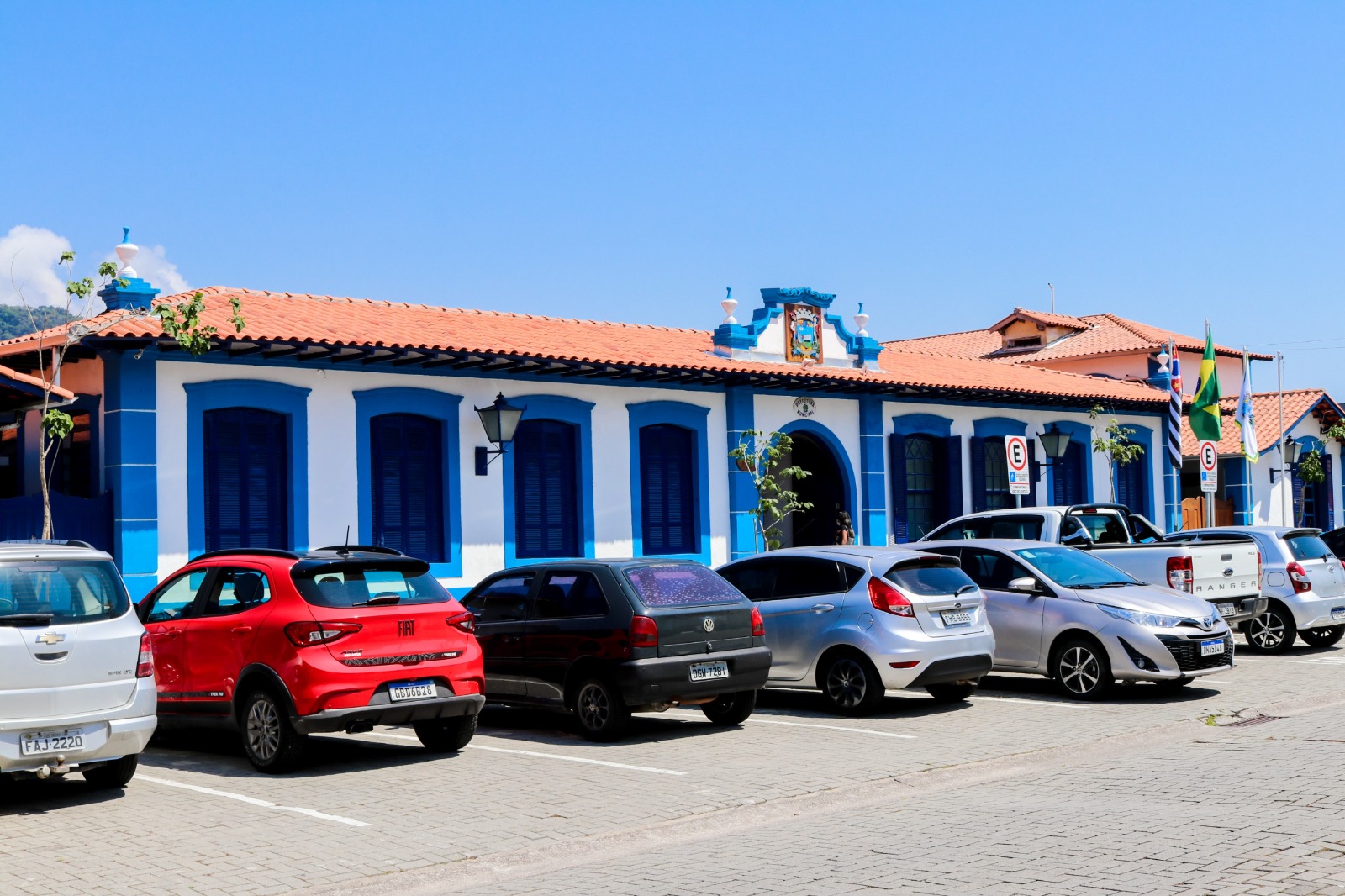 #PraTodosVerem: Duas fotos mostram um prédio histórico pintado de branco com detalhes em azul vibrante, onde funciona a Prefeitura Municipal. A construção possui janelas e portas emolduradas, um grande portão em arco central e o brasão da cidade no alto da fachada. O telhado é de telhas cerâmicas e o céu está azul, sem nuvens. Na segunda imagem, é possível ver a fachada completa, com vários carros estacionados em frente ao prédio e bandeiras hasteadas ao lado direito.Fim da descrição.