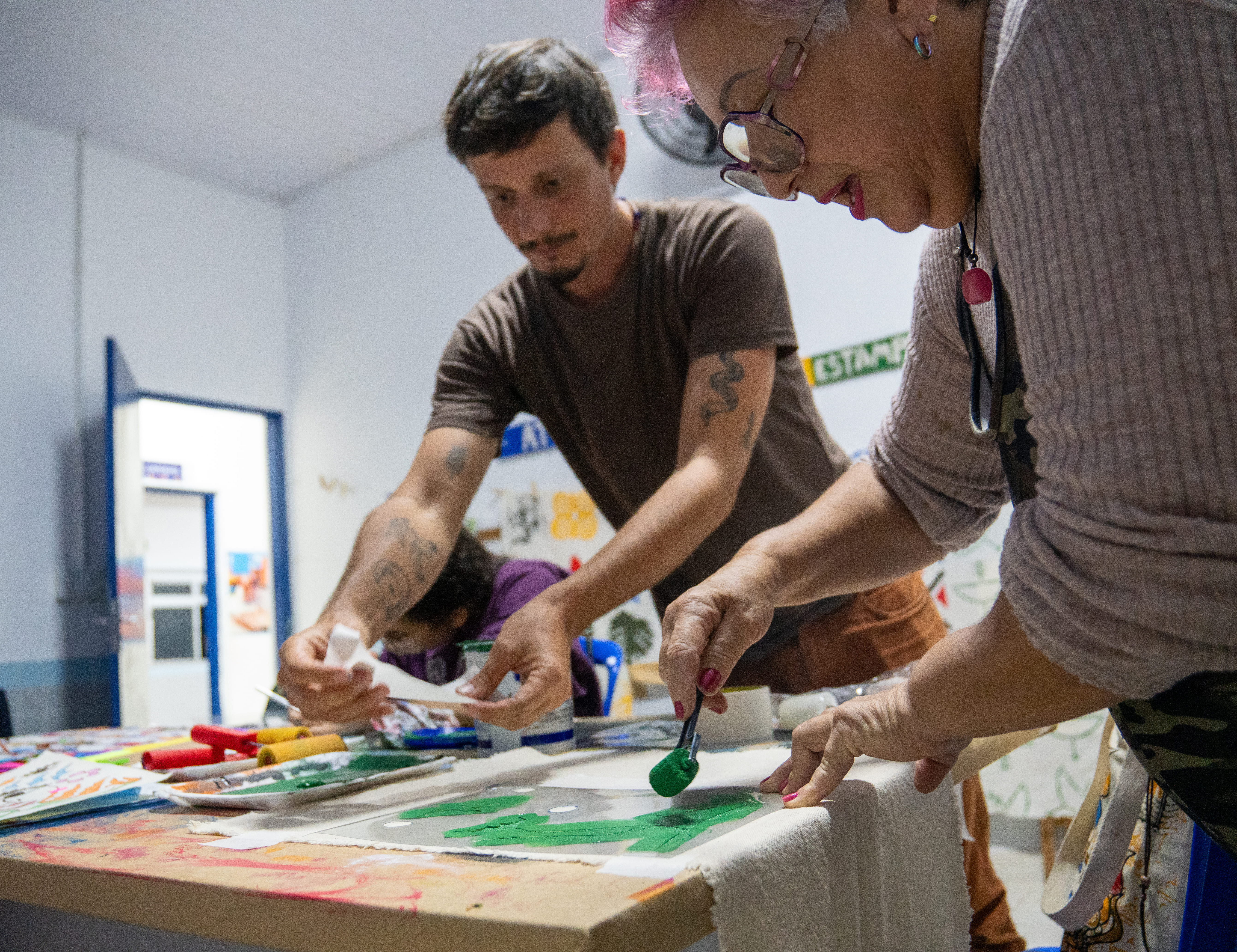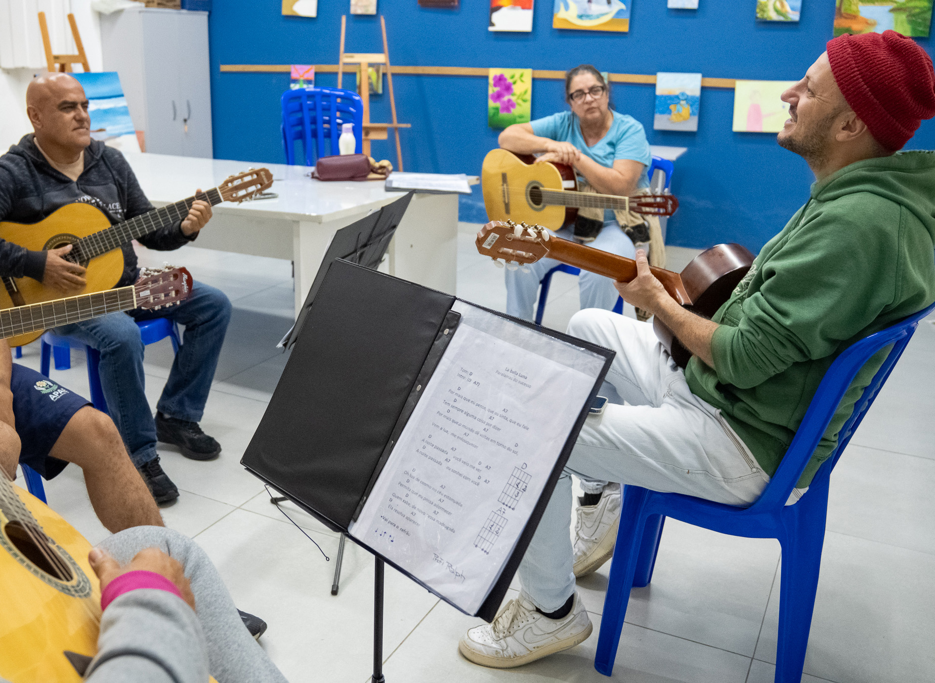 #PraTodosVerem: Pessoas participam de aulas das Oficinas Culturais de Fundass, incluindo violão, pintura e cerâmica. Elas estão reunidas em salas de atividades, aprendendo e criando em ambiente acolhedor e colaborativo. Fim da descrição.