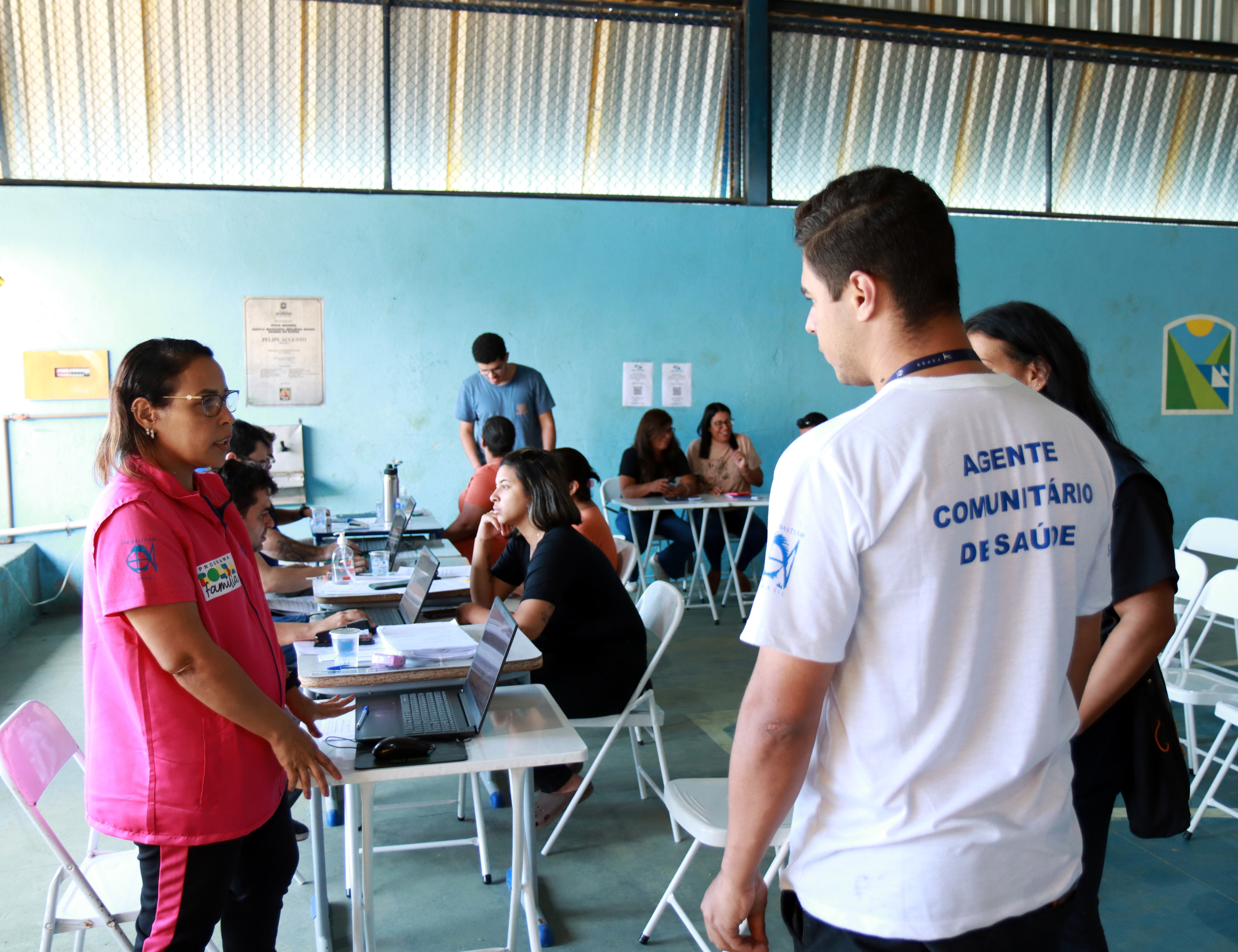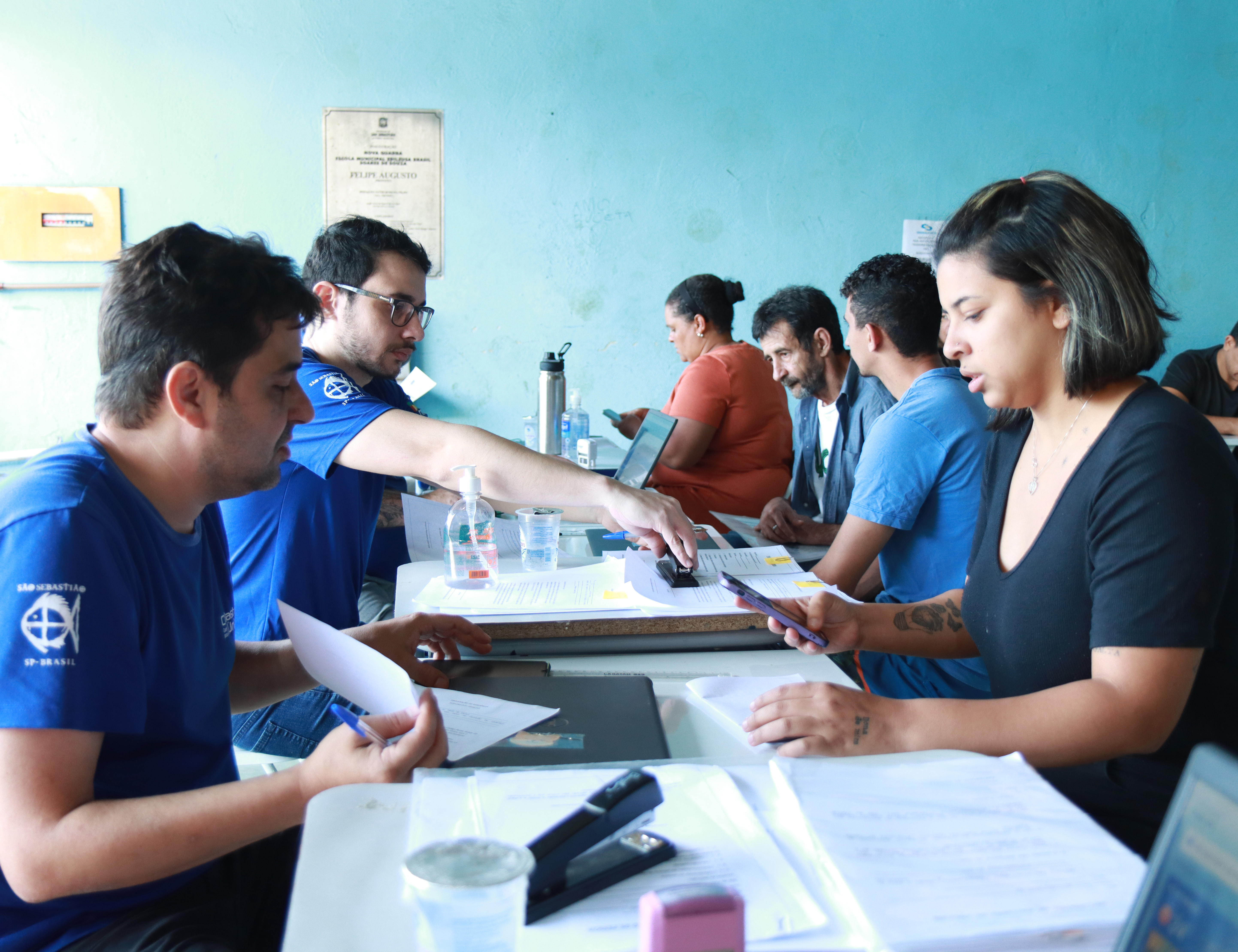 #PraTodosVerem: Imagens mostram equipes da Sedes atendendo moradores durante a Ação Social Móvel em Maresias, na quadra da escola municipal. Servidores realizam cadastros e orientações em mesas com notebooks, em um ambiente coberto e sinalizado com o logotipo da Prefeitura de São Sebastião. Fim da descrição.