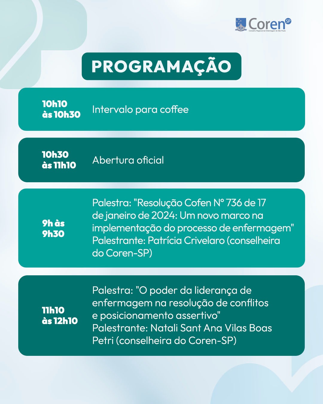 A programação, que ocorrerá das 7h30 às 12h10, inclui palestras sobre temas essenciais para a profissão, como liderança, saúde sexual e reprodutiva, e as novas diretrizes do processo de enfermagem, além de uma apresentação especial sobre as ações e programas do Coren-SP.