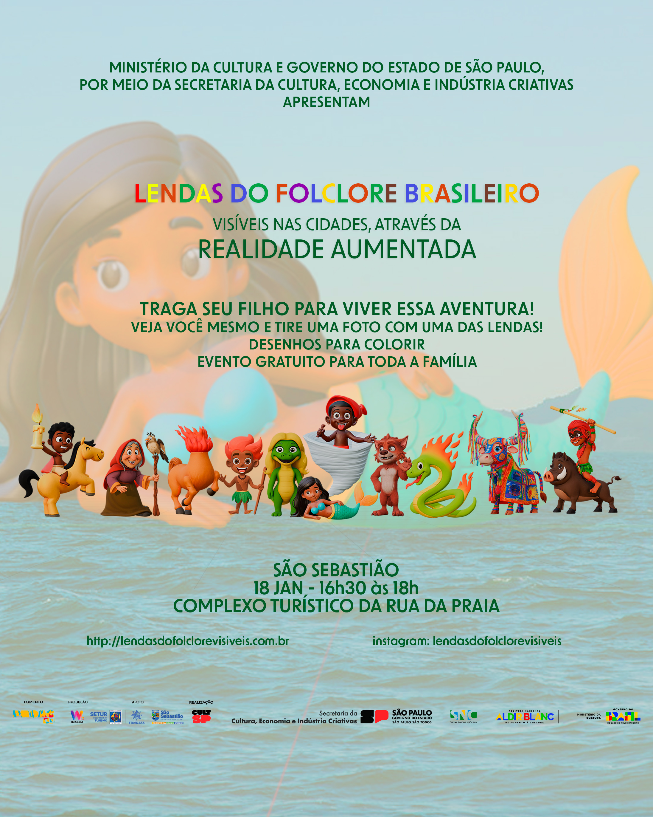 O município de São Sebastião recebe, neste domingo (18/01), o projeto ‘Lendas do Folclore Brasileiro Visível nas Cidades, através de Realidade Aumentada (RA)’, uma experiência cultural gratuita que une tecnologia, arte e tradição popular. A atividade ocorre das 16h30 às 18h, no quiosque para visitantes na Praça do Artesão do Complexo Turístico da Rua da Praia, no Centro Histórico.