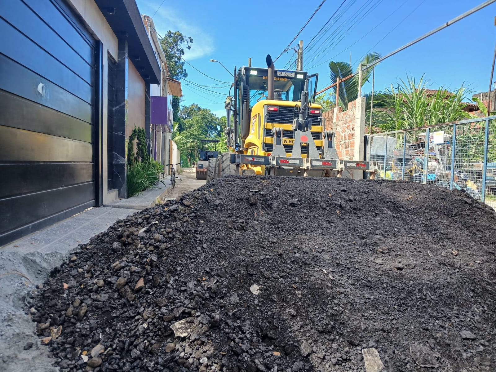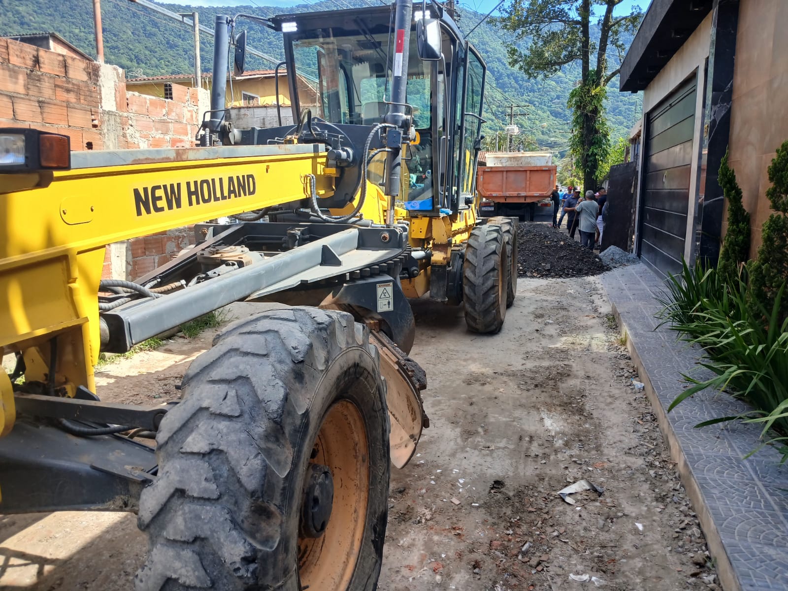 #PraTodosVerem: sequência de imagens dos serviços de perenização e nivelamento da Rua Atlantis, realizado pela Prefeitura de São Sebastião, por meio da Sesep. Fim da descrição.