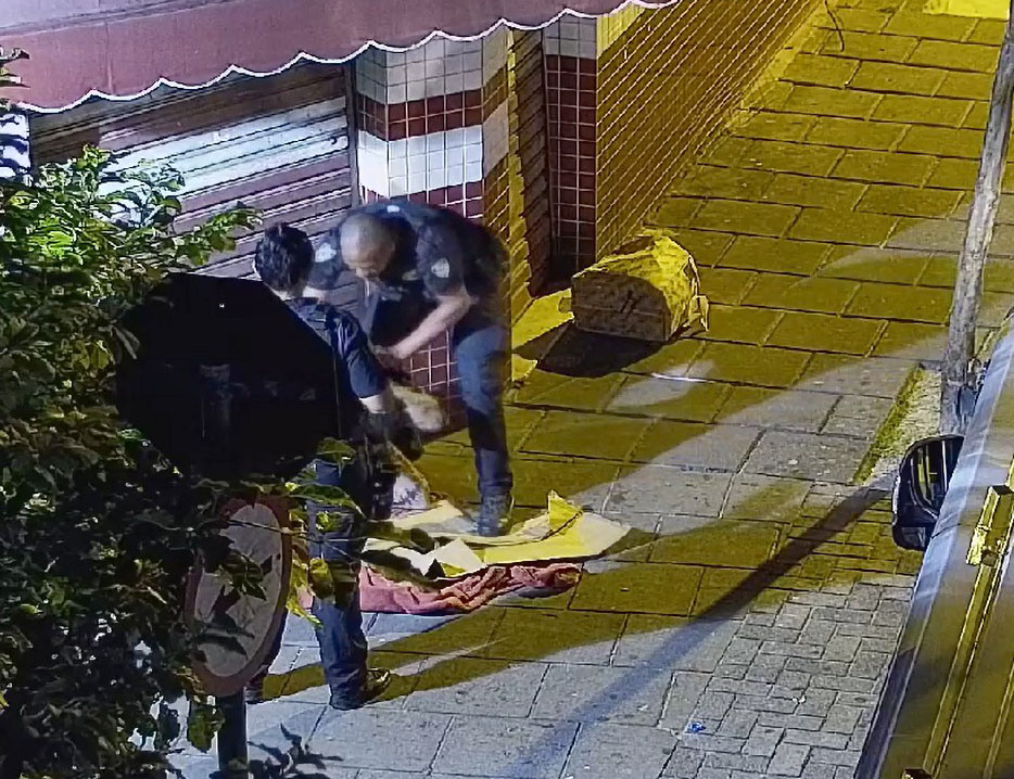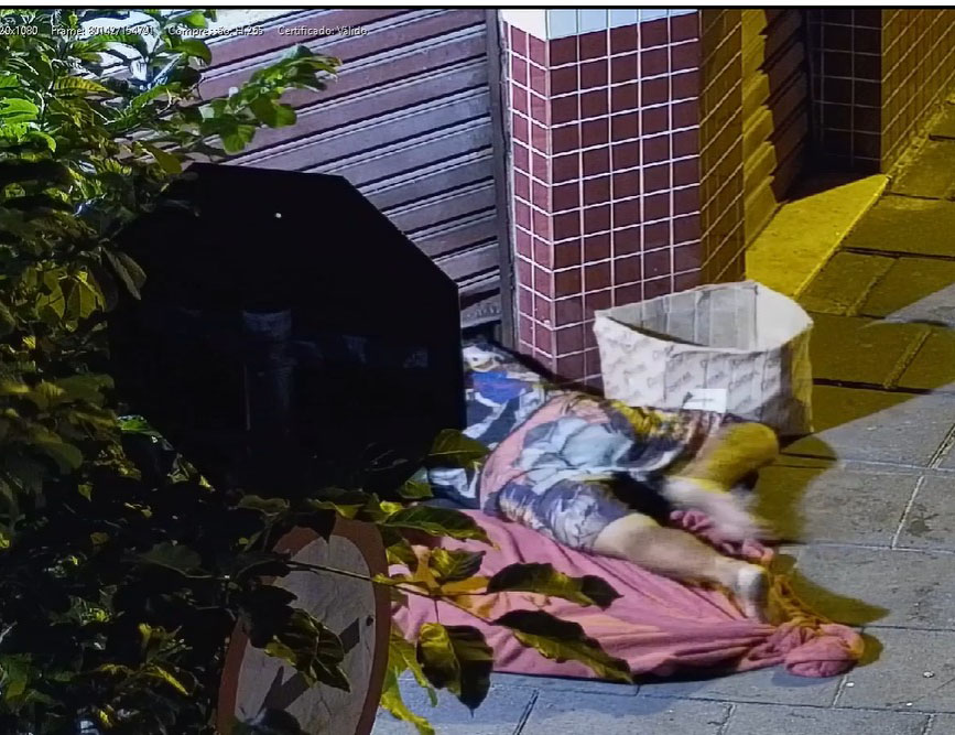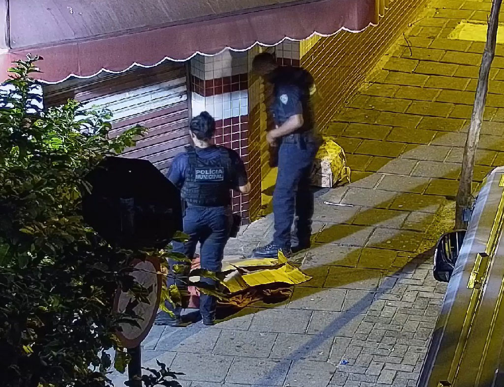 #PraTodosVerem: A sequência de quatro imagens de câmeras de segurança mostra, sob luz amarelada noturna, uma calçada de pedras em frente a um comércio com portas de aço fechadas e detalhes em azulejos vermelhos e brancos. Um indivíduo aparece deitado no chão coberto por mantas coloridas e cercado por caixas de papelão, até que dois agentes da Guarda Civil Municipal, usando fardas escuras e coletes com a inscrição "POLÍCIA MUNICIPAL", aproximam-se para realizar uma abordagem e inspeção no local. A cena é emoldurada por árvores, um poste de luz decorativo e a lateral de um veículo estacionado. Fim da descrição.